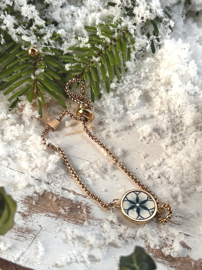 Ce bracelet porte autant la délicatesse du bijou contemporain que l’âme d’une assiette ancienne, transformée en petit trésor. Une création poétique, symbolique et totalement unique.