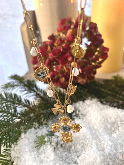 La première chaîne, fine et délicate, porte un petit médaillon façonné dans un fragment d’assiette ancienne de couleur bleue. Chaque éclat de faïence est soigneusement découpé, poncé puis serti à la main, donnant naissance à un bijou unique empreint d’histoire.