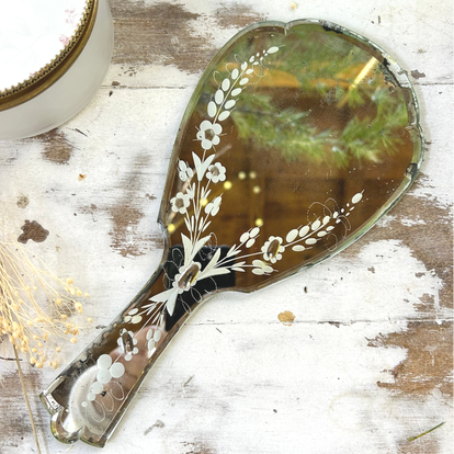 Miroir à main biseauté avec motif floral dépoli. Le miroir a des marques du temps. Le dessous est en feutrine vert foncé