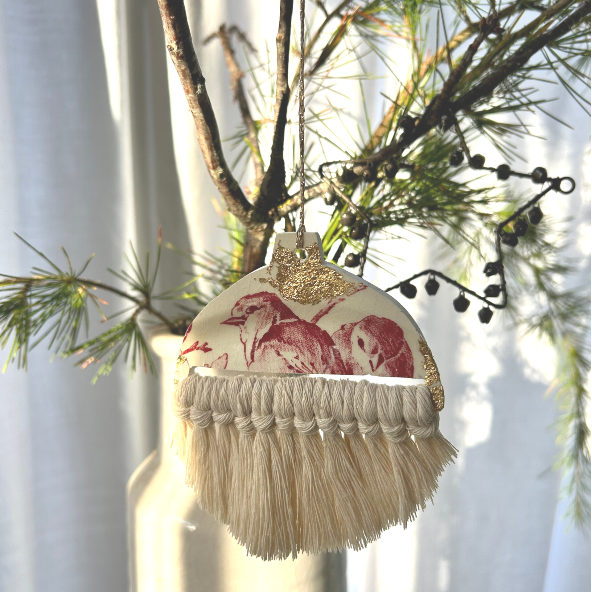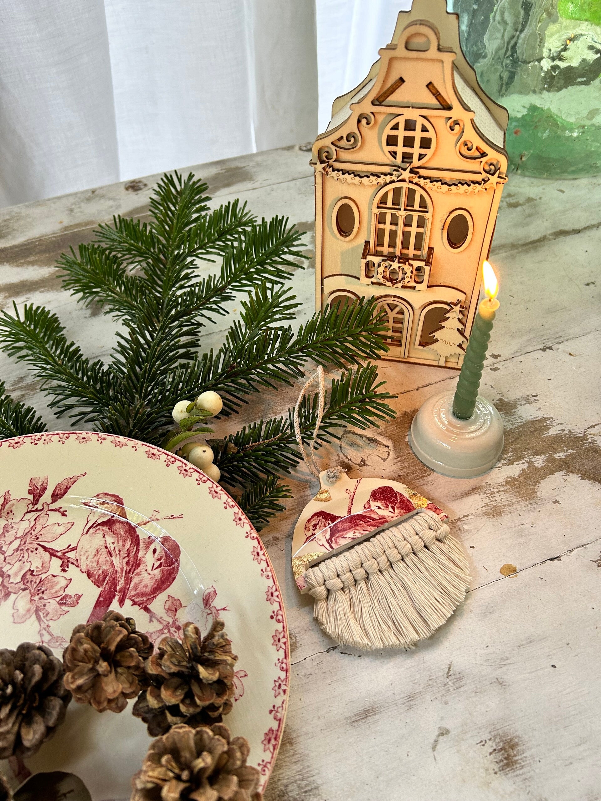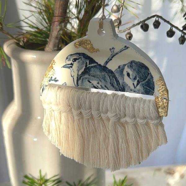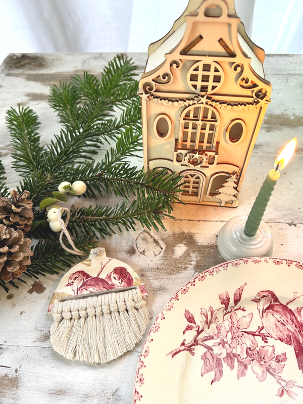 Boule de Noël réalisée dans une assiette terre de fer Sarreguemines modèle Favori et coton macramé