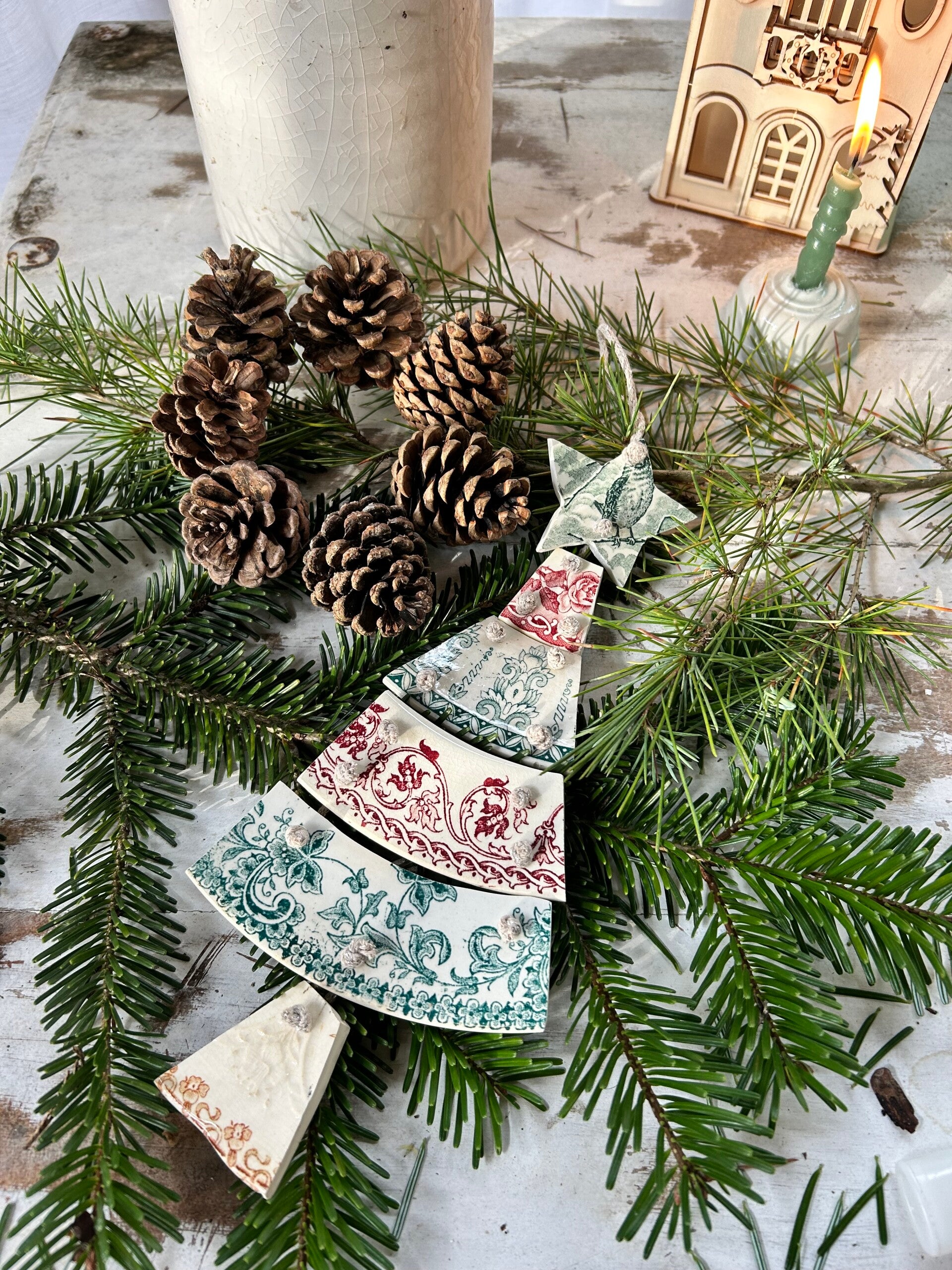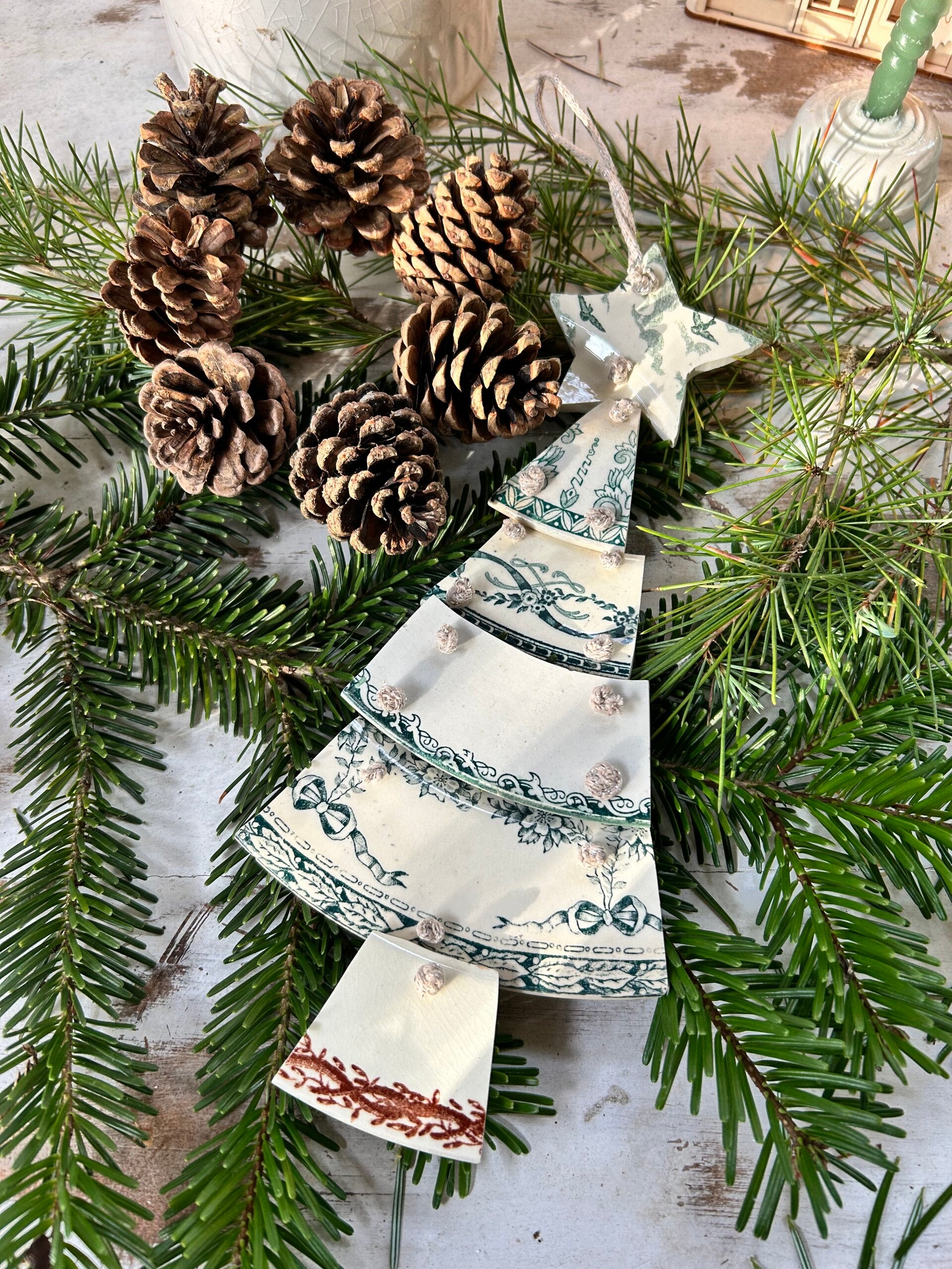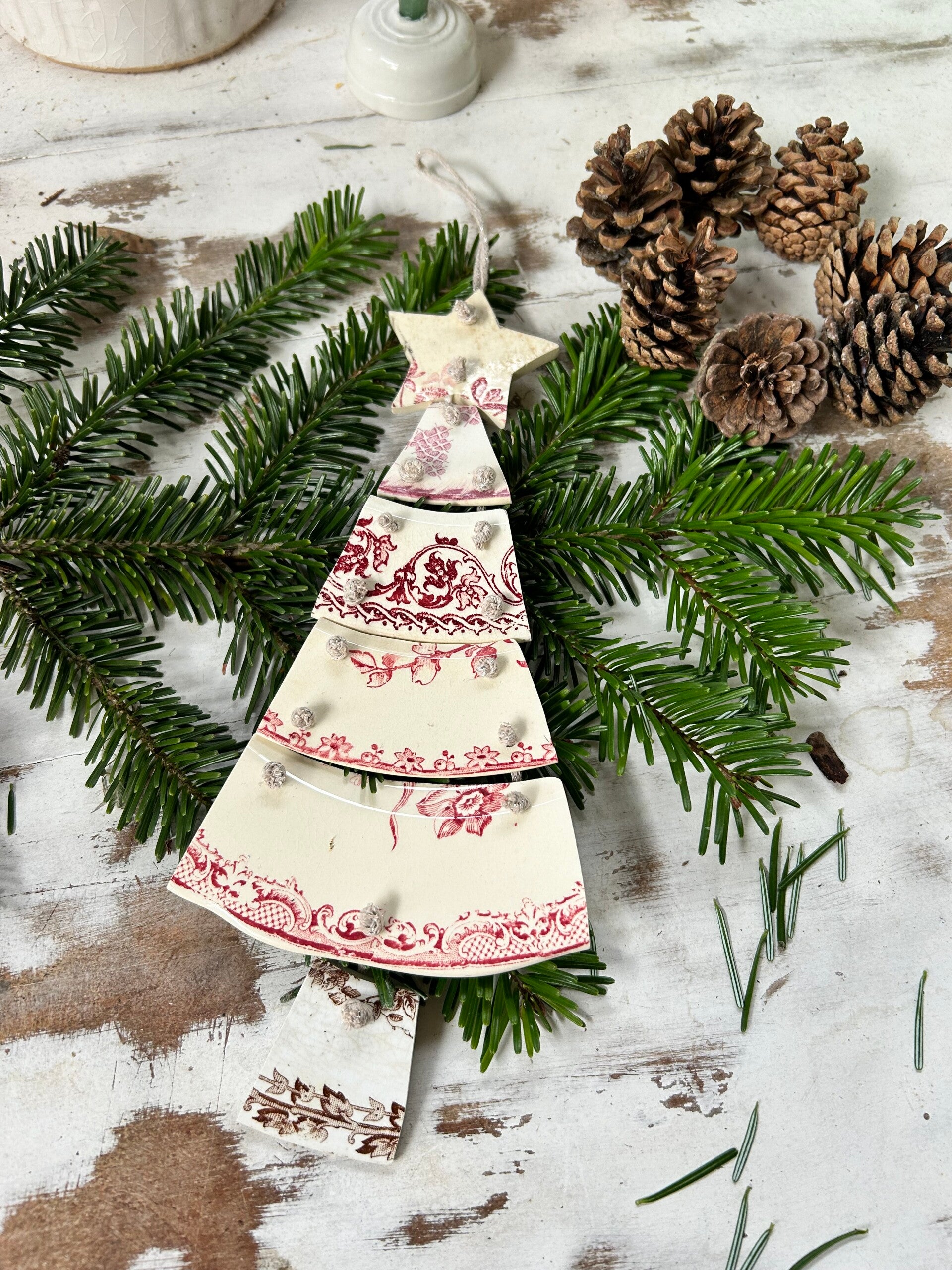 Sapin articulé taillé dans des assiettes terre de fer de différents modèles et reliés par un fil de coton pailleté DMC