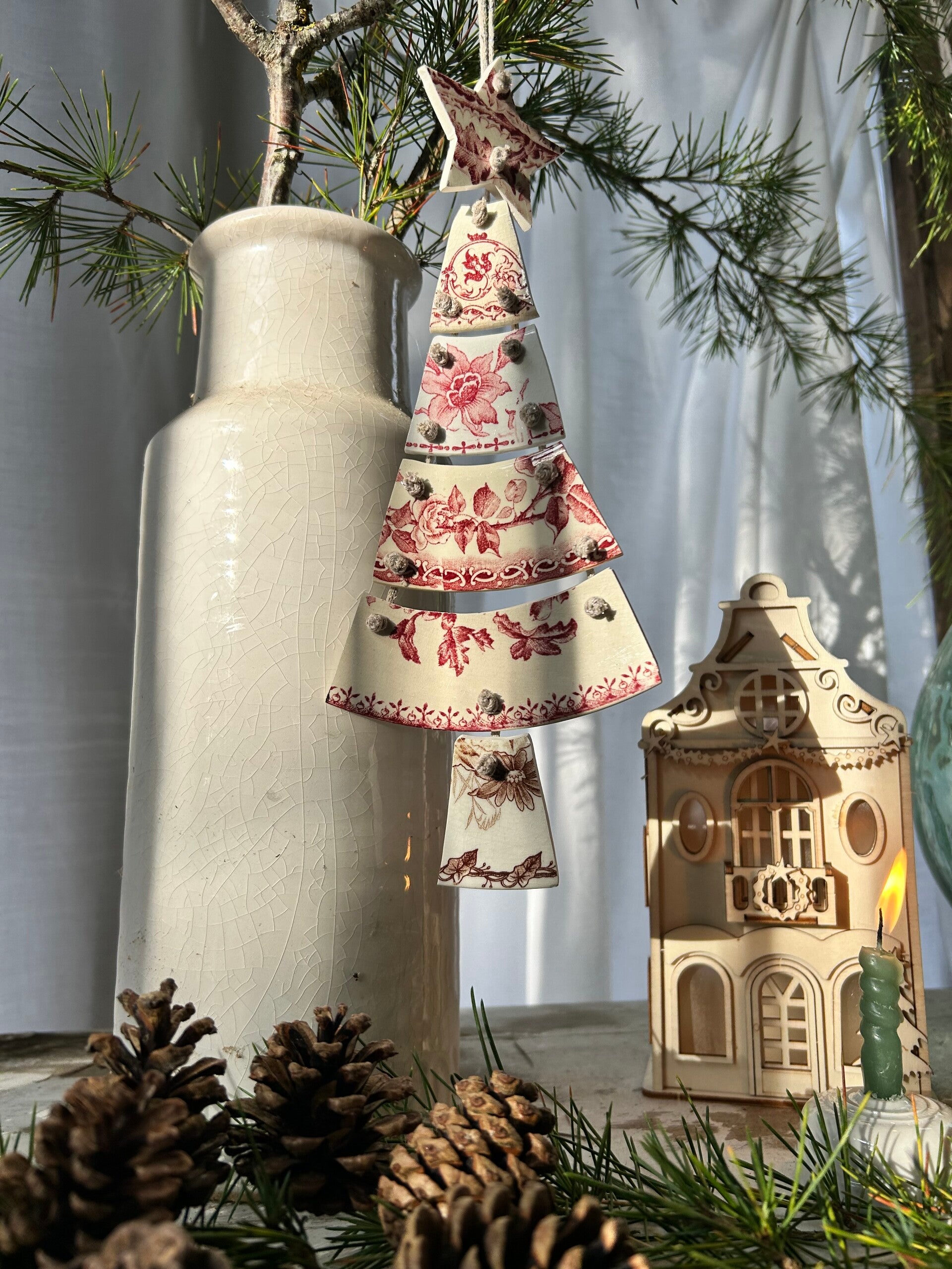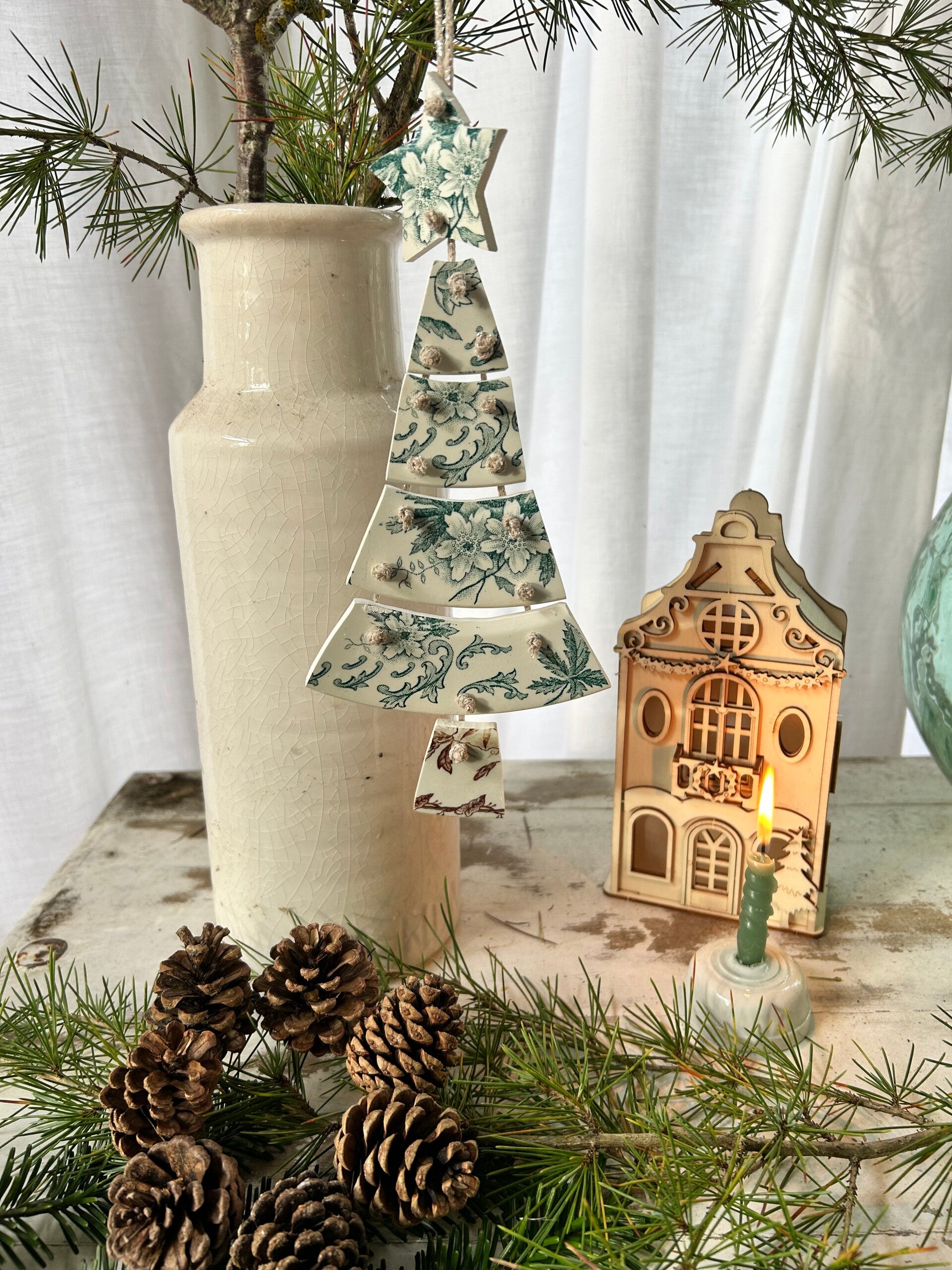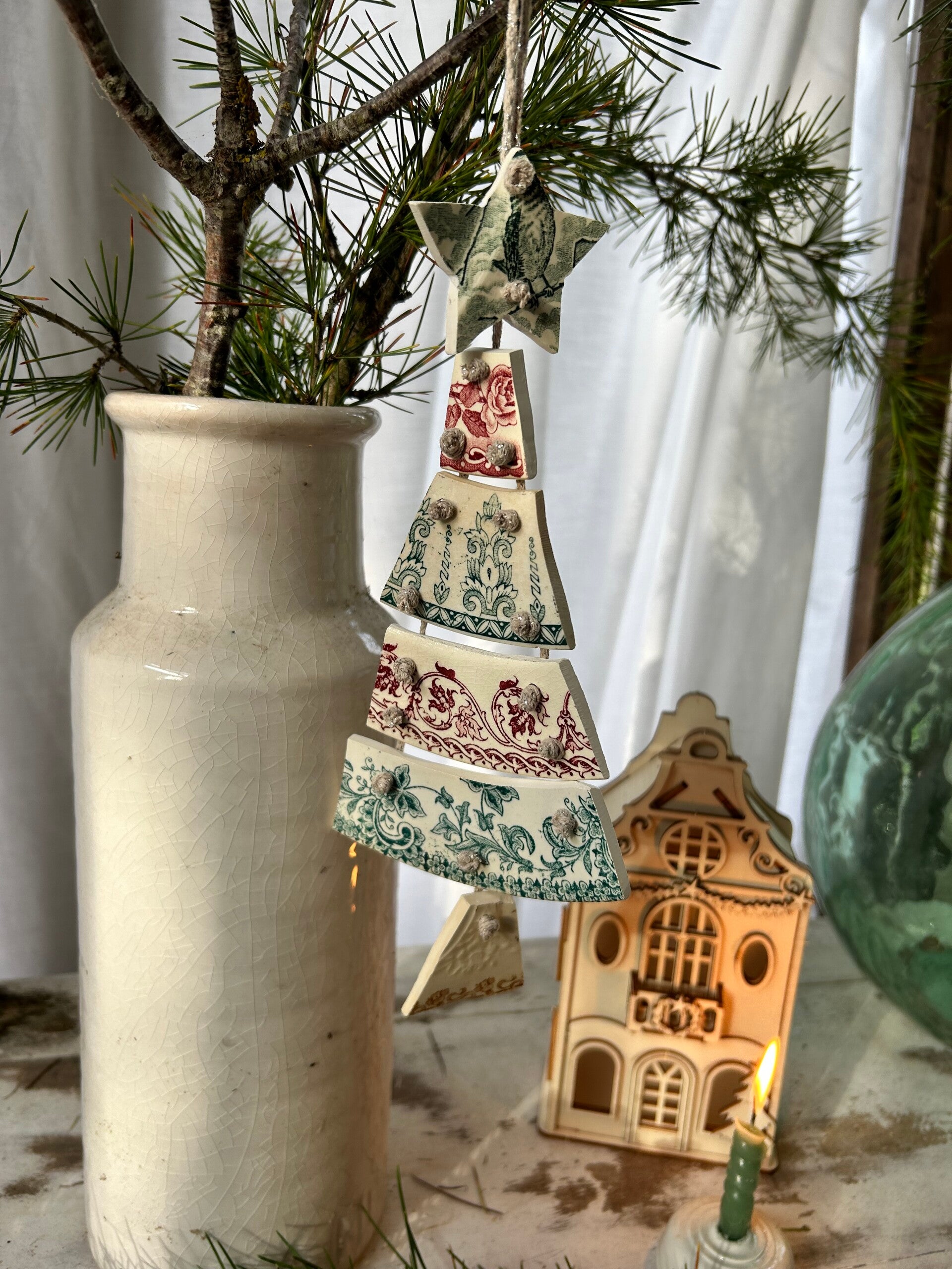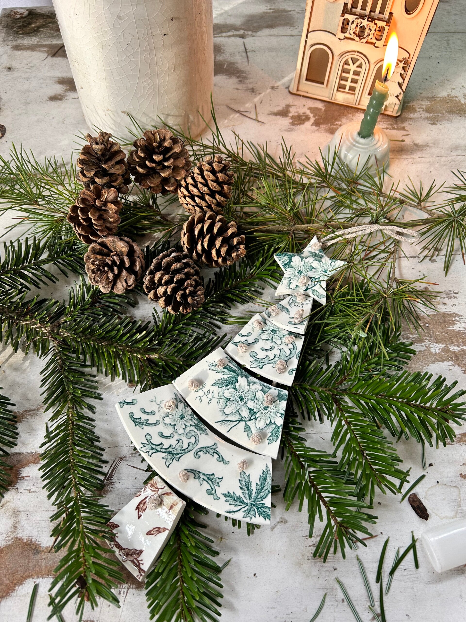 Sapin articulé taillé dans des assiettes terre de fer de différents modèles et reliés par un fil de coton pailleté DMC