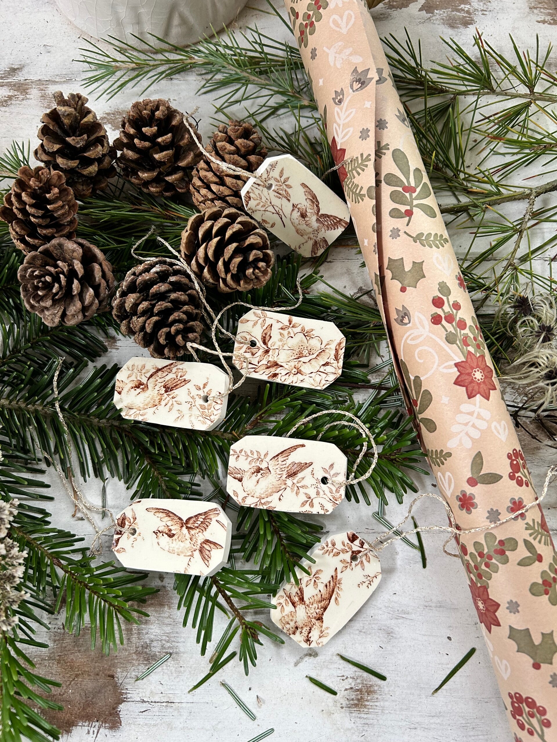 Lot de 6 étiquettes taillées dans une assiette terre de fer Longwy modèle Cronsradt