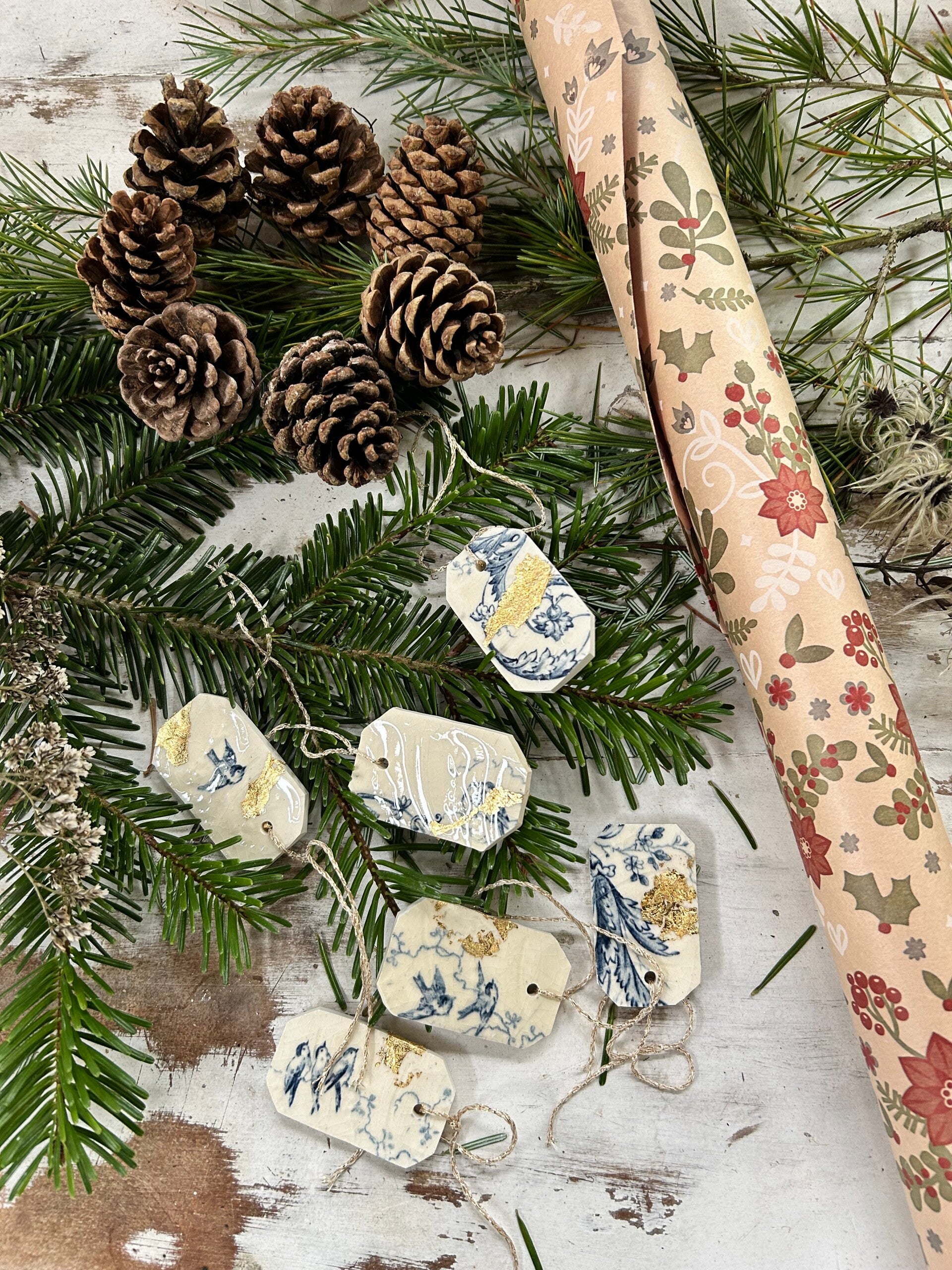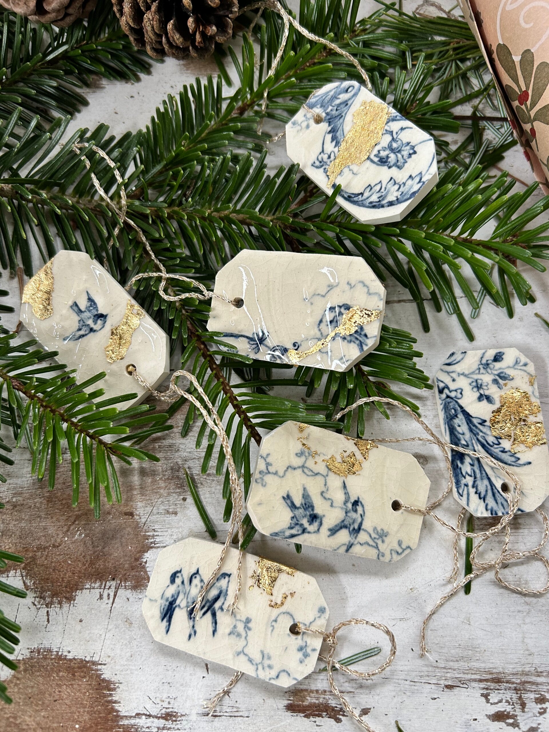 Lot de 6 étiquettes taillées dans une assiette terre de fer Gien modèle Rinceaux