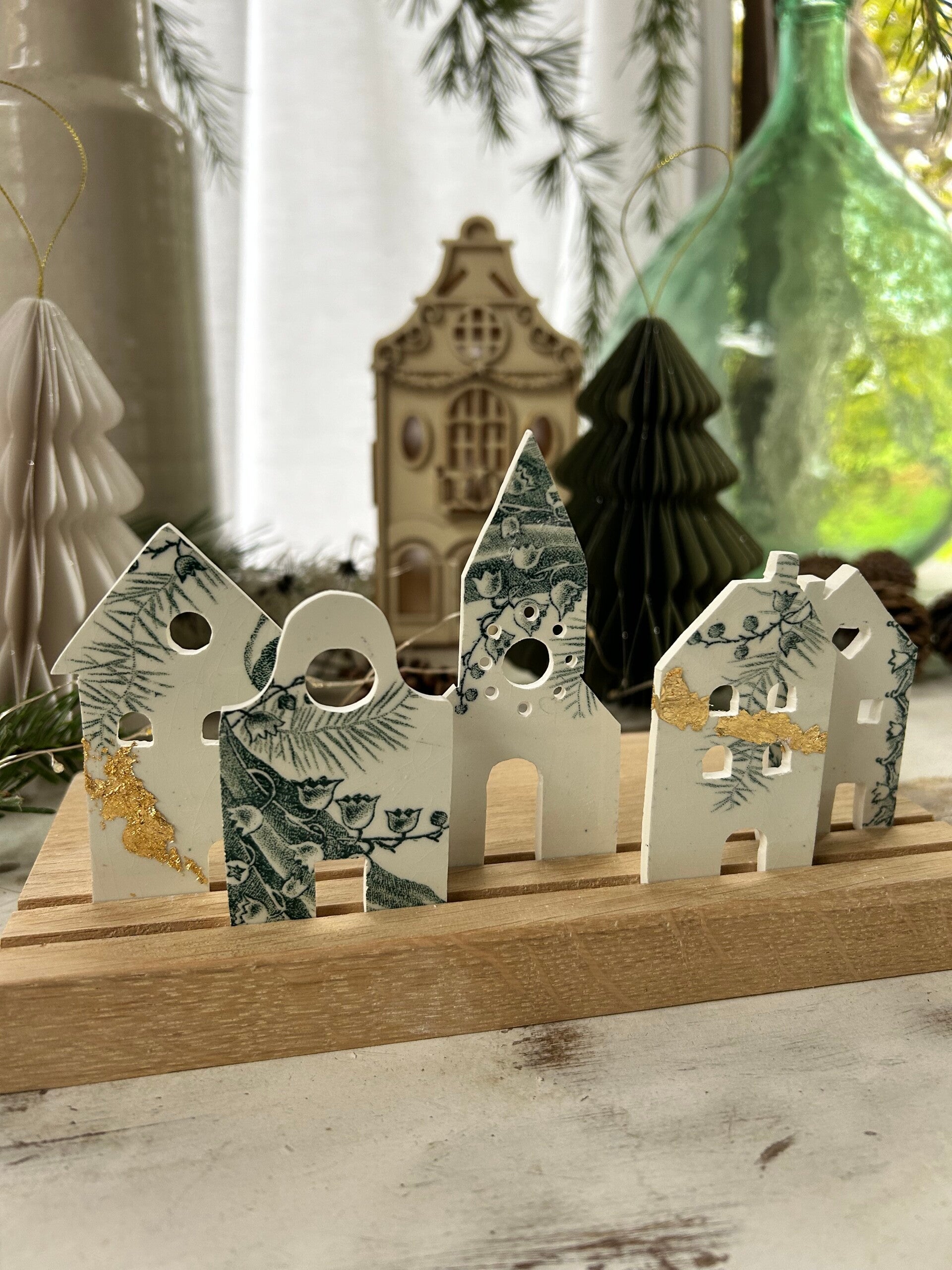 Village taillé dans une assiette Terre de fer Saint Amand modèle Muguet (vert)