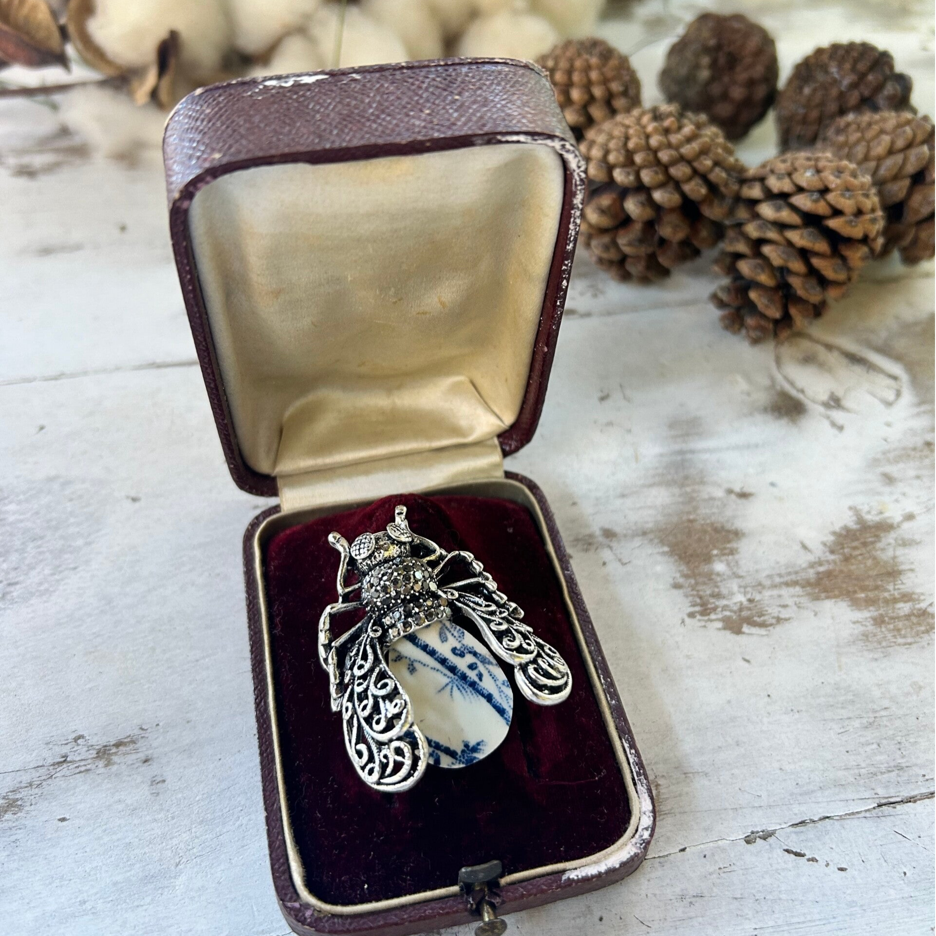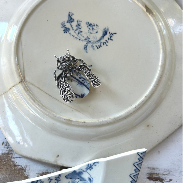 Scarabée argenté paré de strass et de morceau d'assiette Indiana