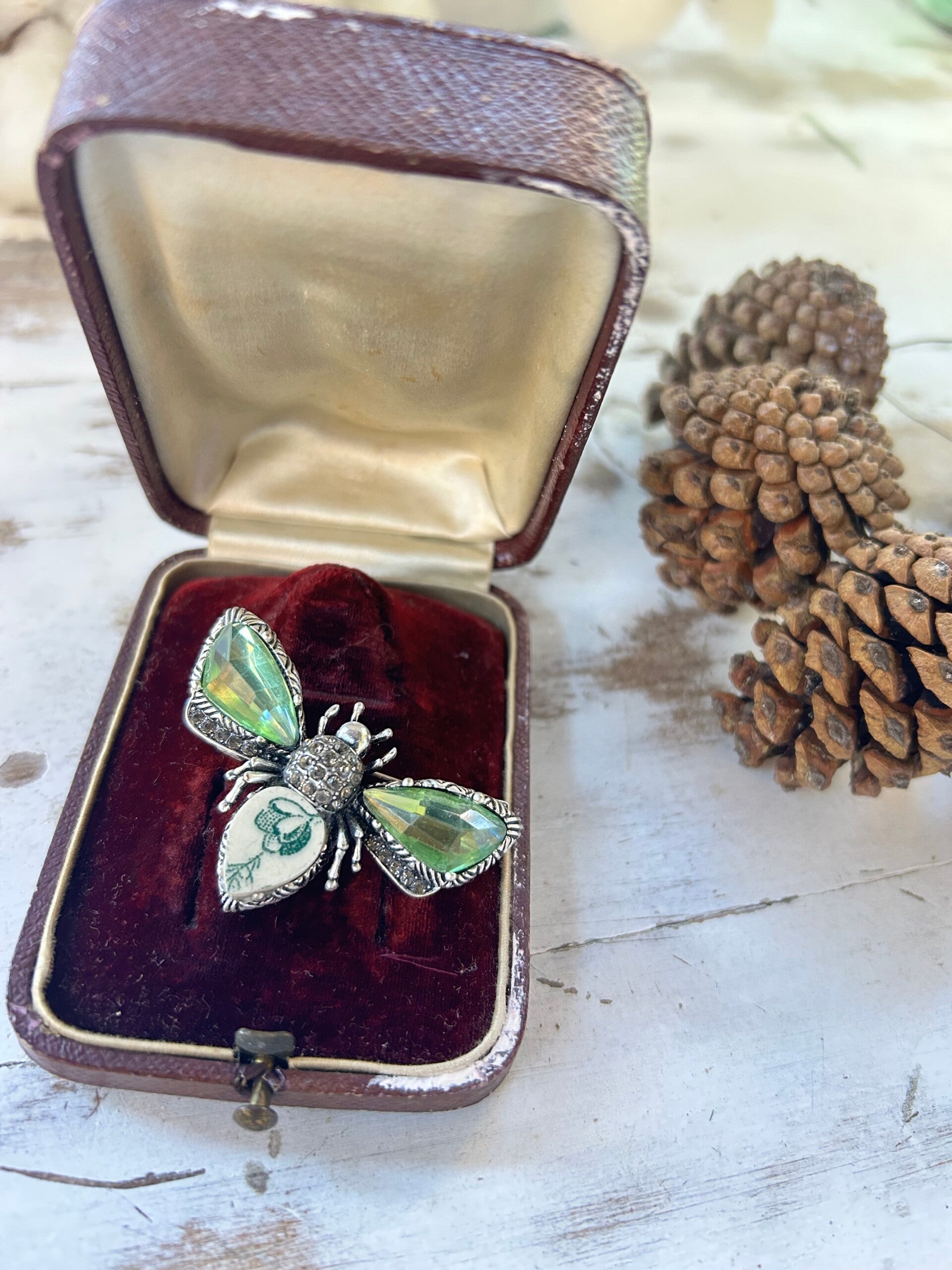 Broche papillon argenté ornée d'un bout d'assiette Creil et Montereau modèle Linotte de couleur verte