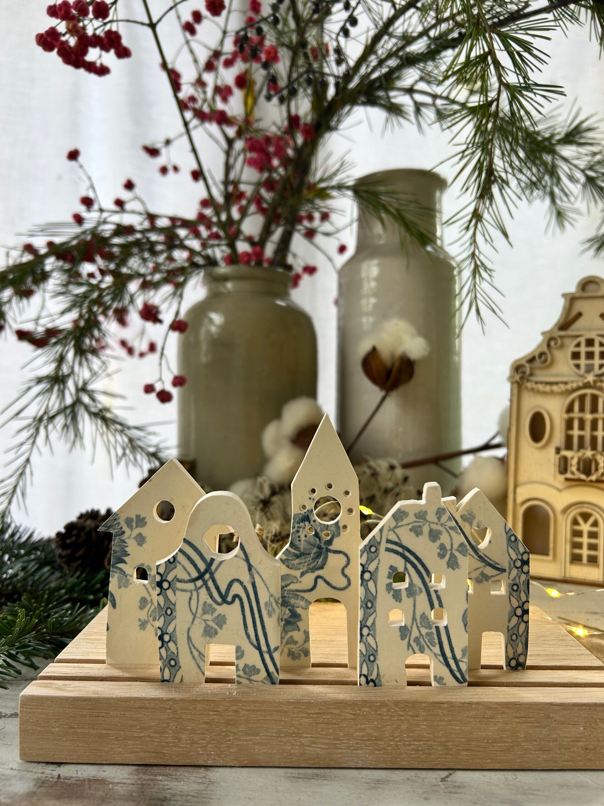 Village taillé dans une assiette Terre de fer Sarreguemines modèle Royat (bleu )