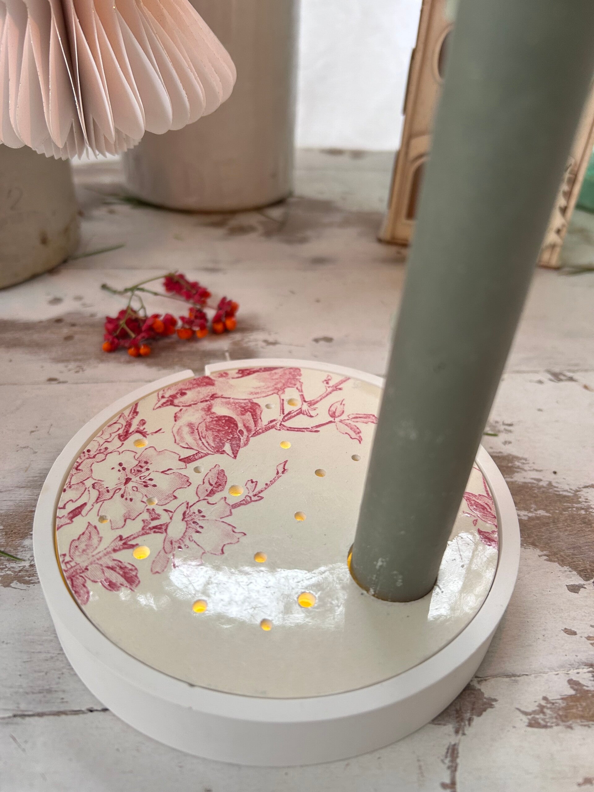 Le couvercle est taillé dans une assiette terre de fer de la manufacture Sarreguemines modèle Favori, lequel a été percé à 2mm, 3mm et 4mm pour laisser passer la lumière