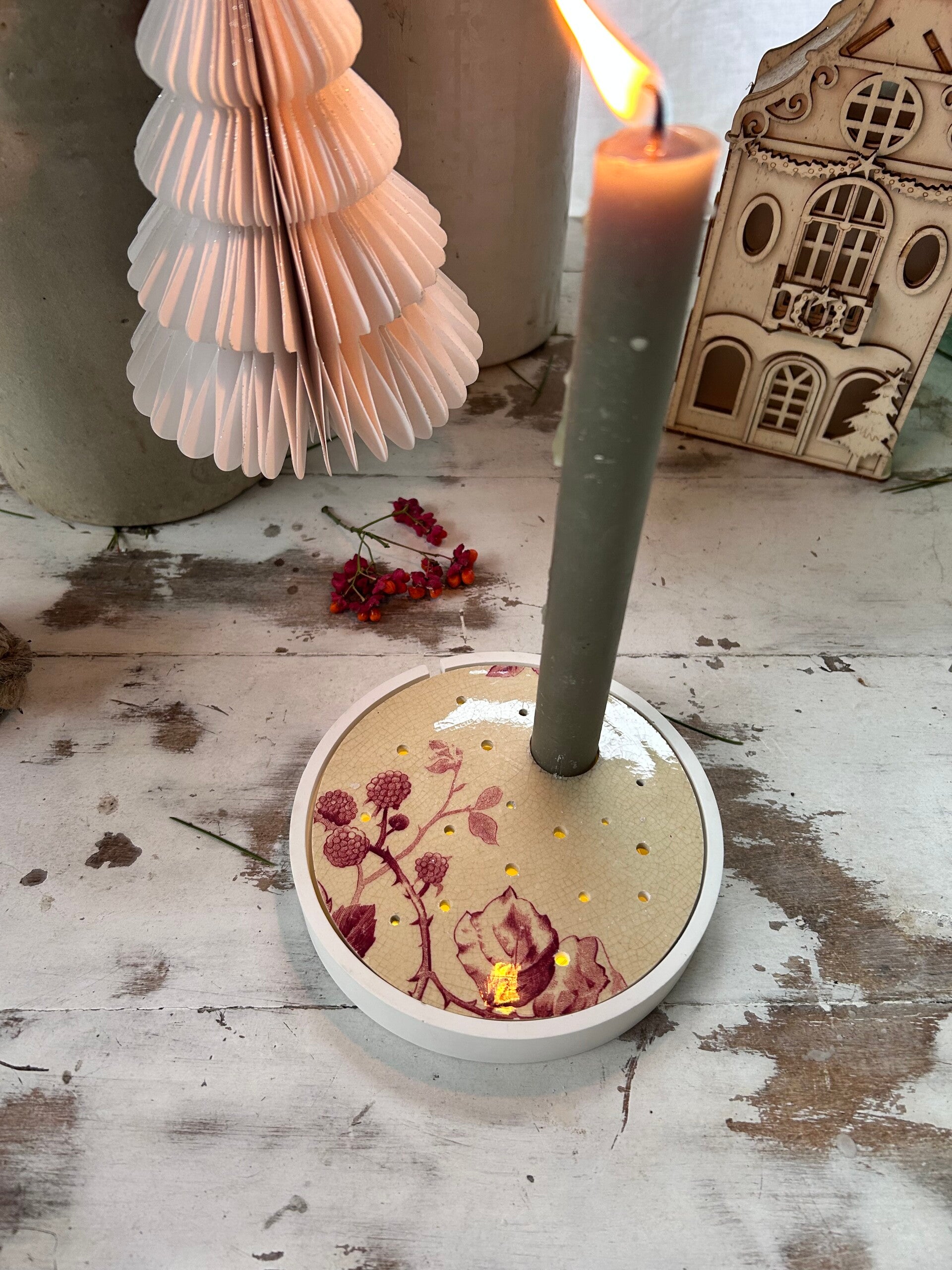 Le couvercle est taillé dans une assiette terre de fer de la manufacture Gien modèle Mûres lequel a été percé à 2mm, 3mm et 4mm pour laisser passer la lumière