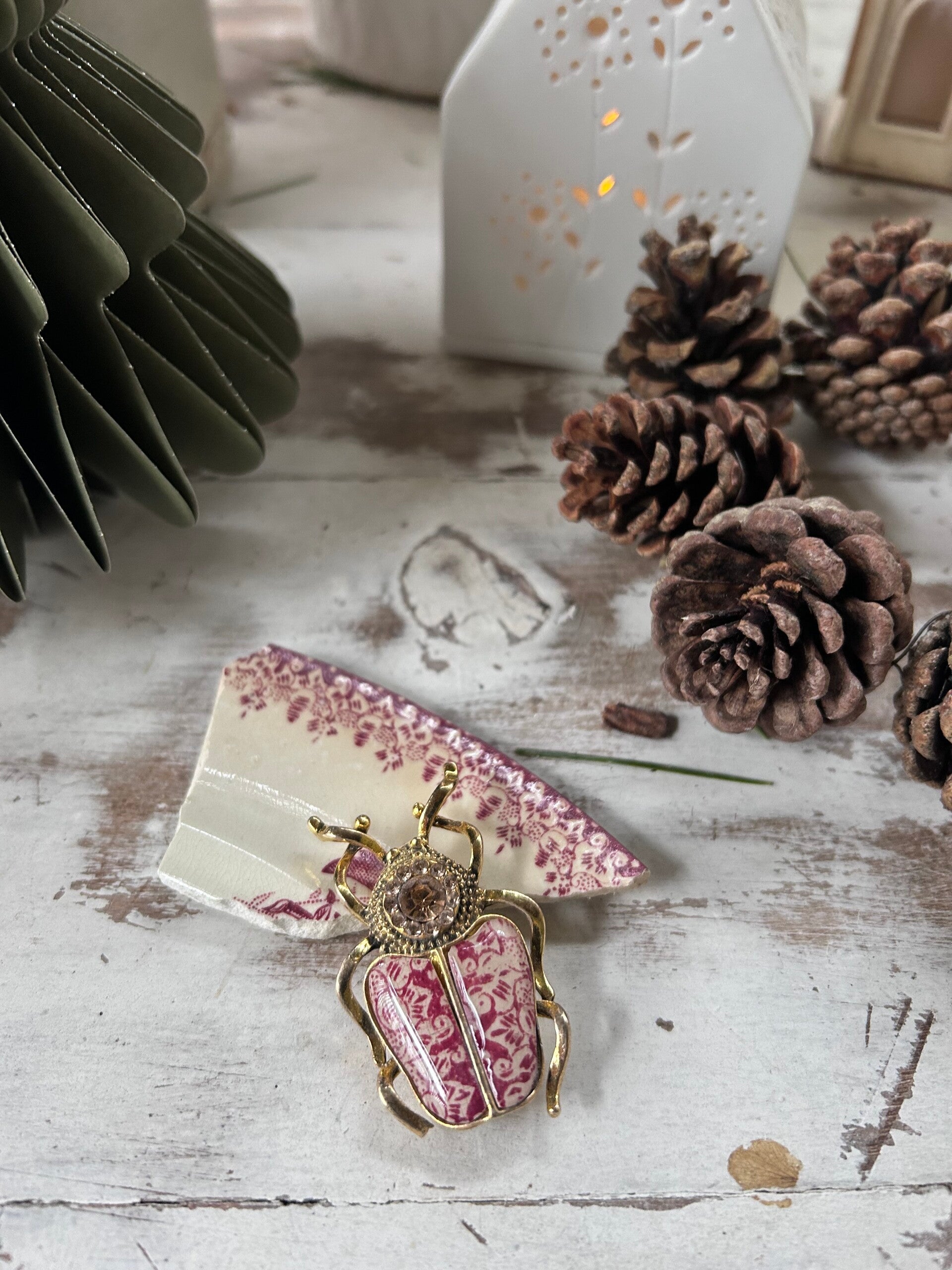 hanneton dore paré de strass et de morceau d'assiette Terre de fer Onnaing modèle Églantine
