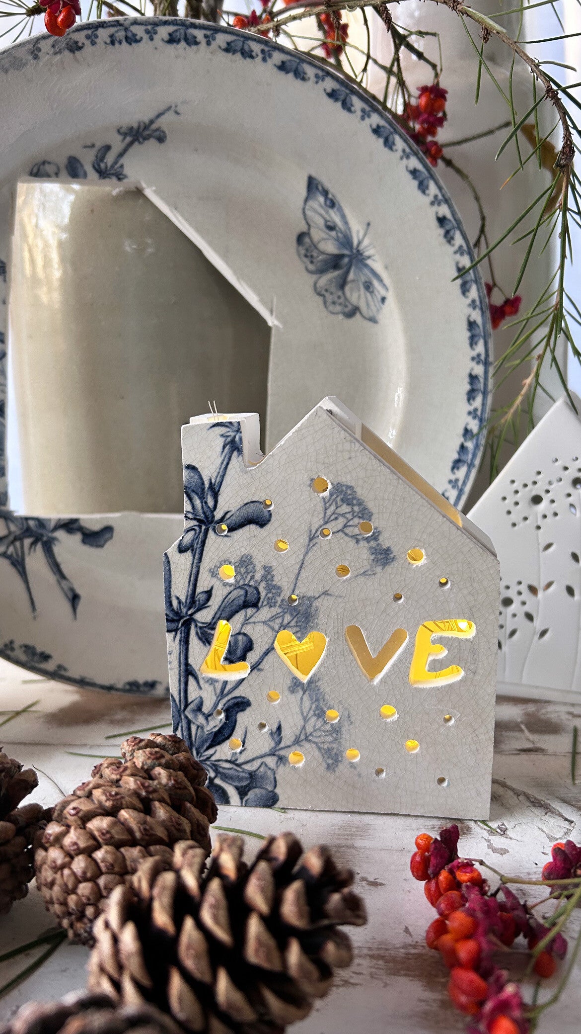 Le couvercle est taillé dans une assiette terre de fer de la manufacture Sarreguemines modèle Carmen , lequel a été percé pour laisser passer la lumière