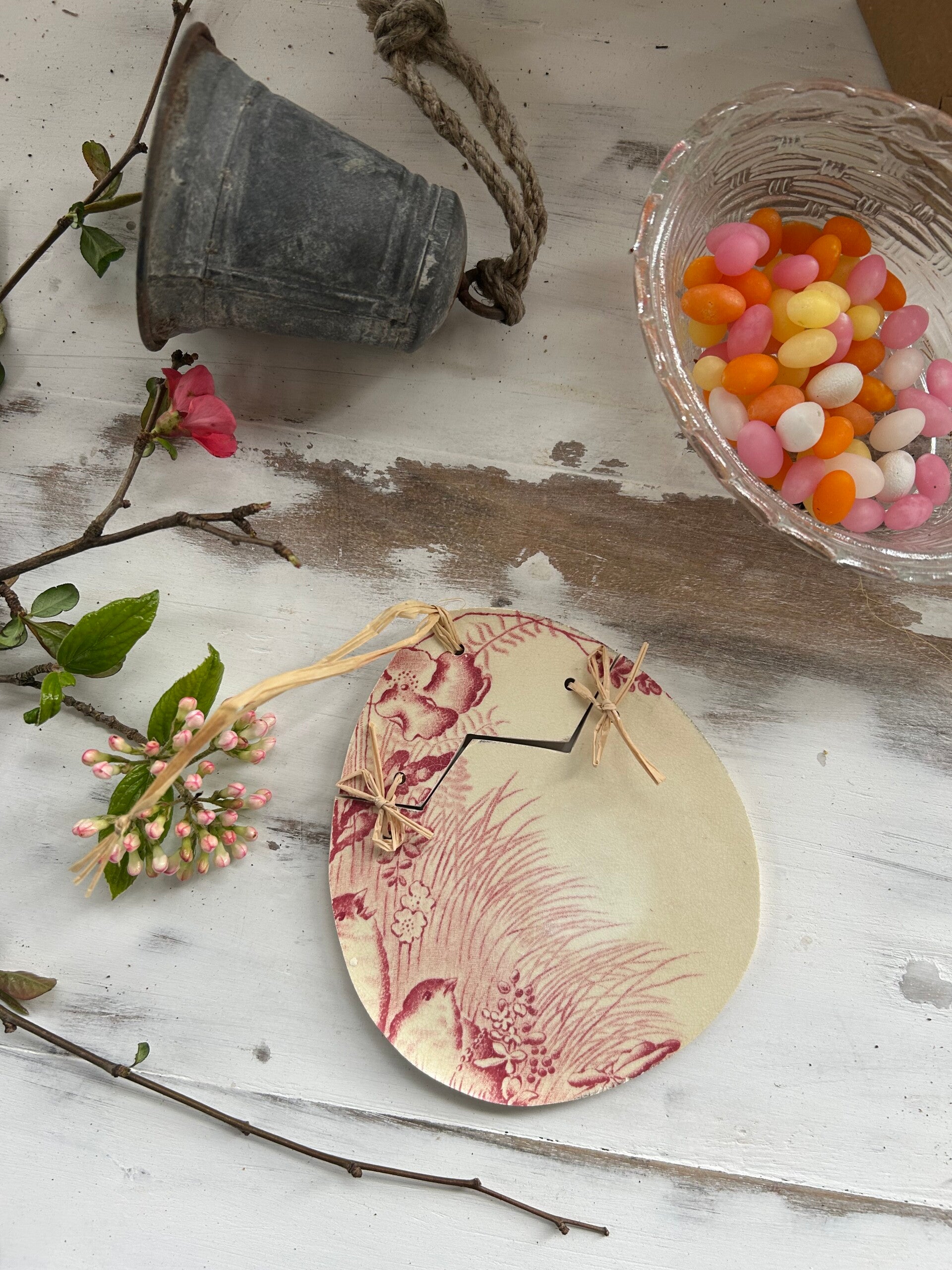 Œuf de Pâques composé de deux parties reliées par un noeud en raphia