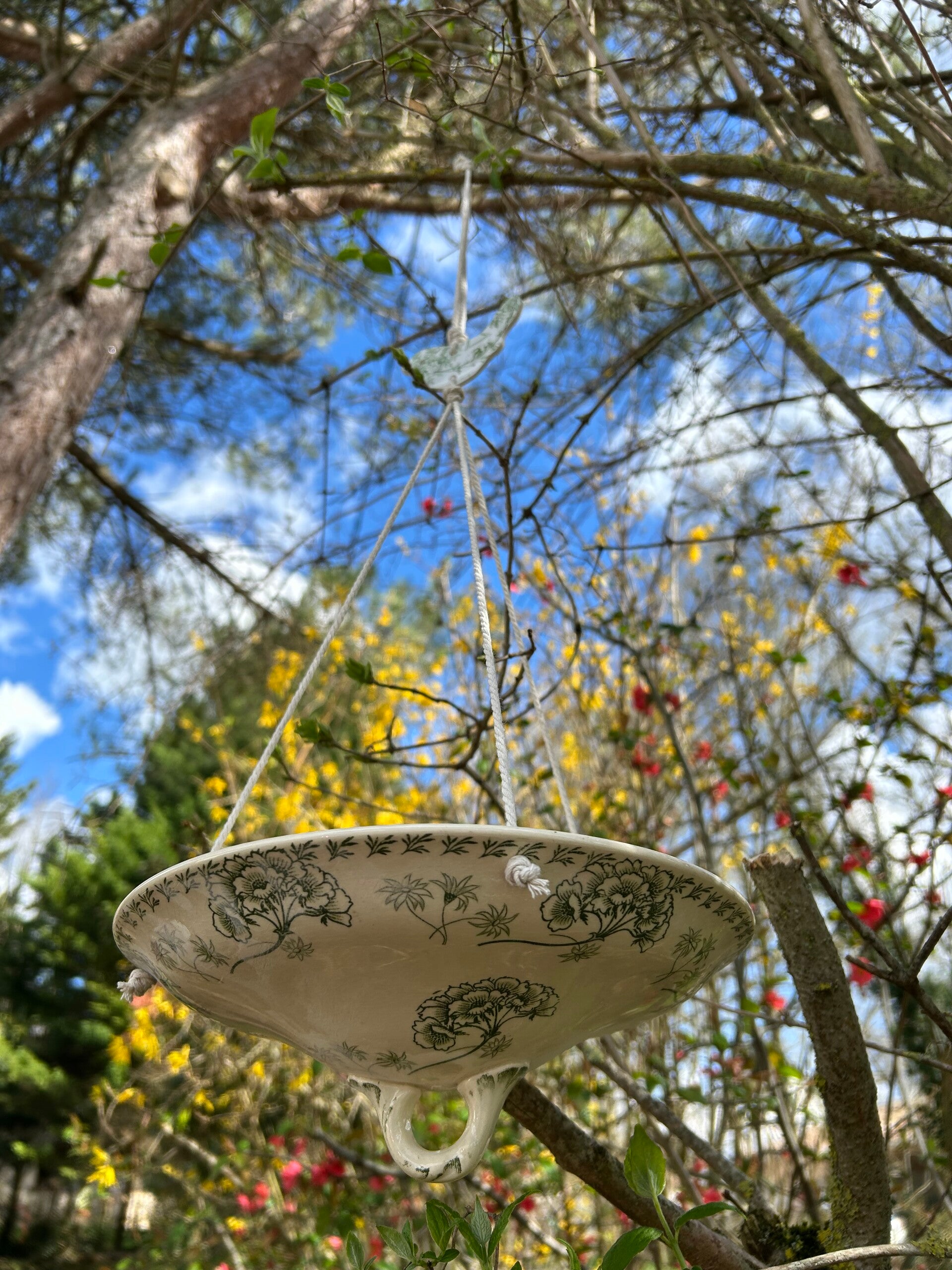 Mangeoire à oiseaux créé avec un couvercle de soupière Sarreguemines modèle Palmyre surmonté d'un oiseau taillé dans une assiette terre de fer
