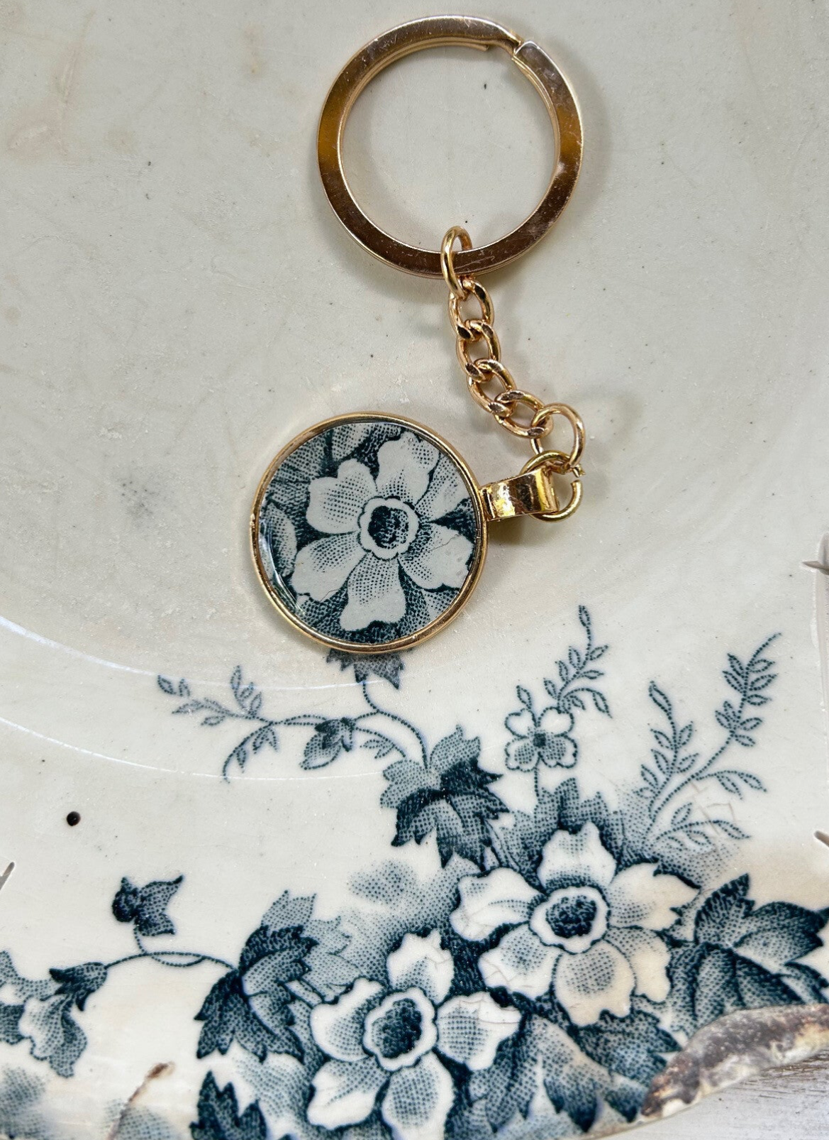 Porte clés dont le cabochon a été taillé dans une assiette Saint Amand Marie Louise