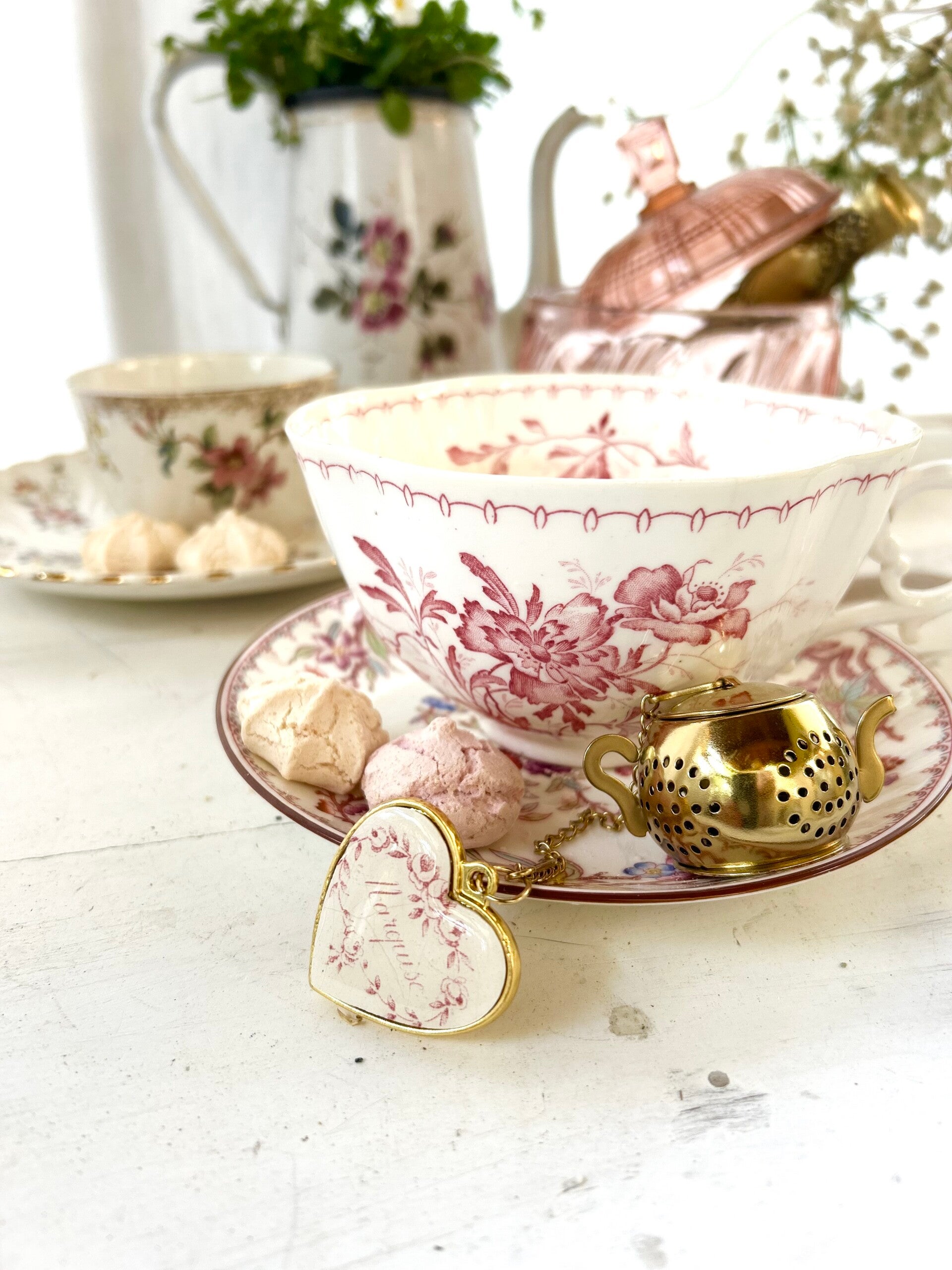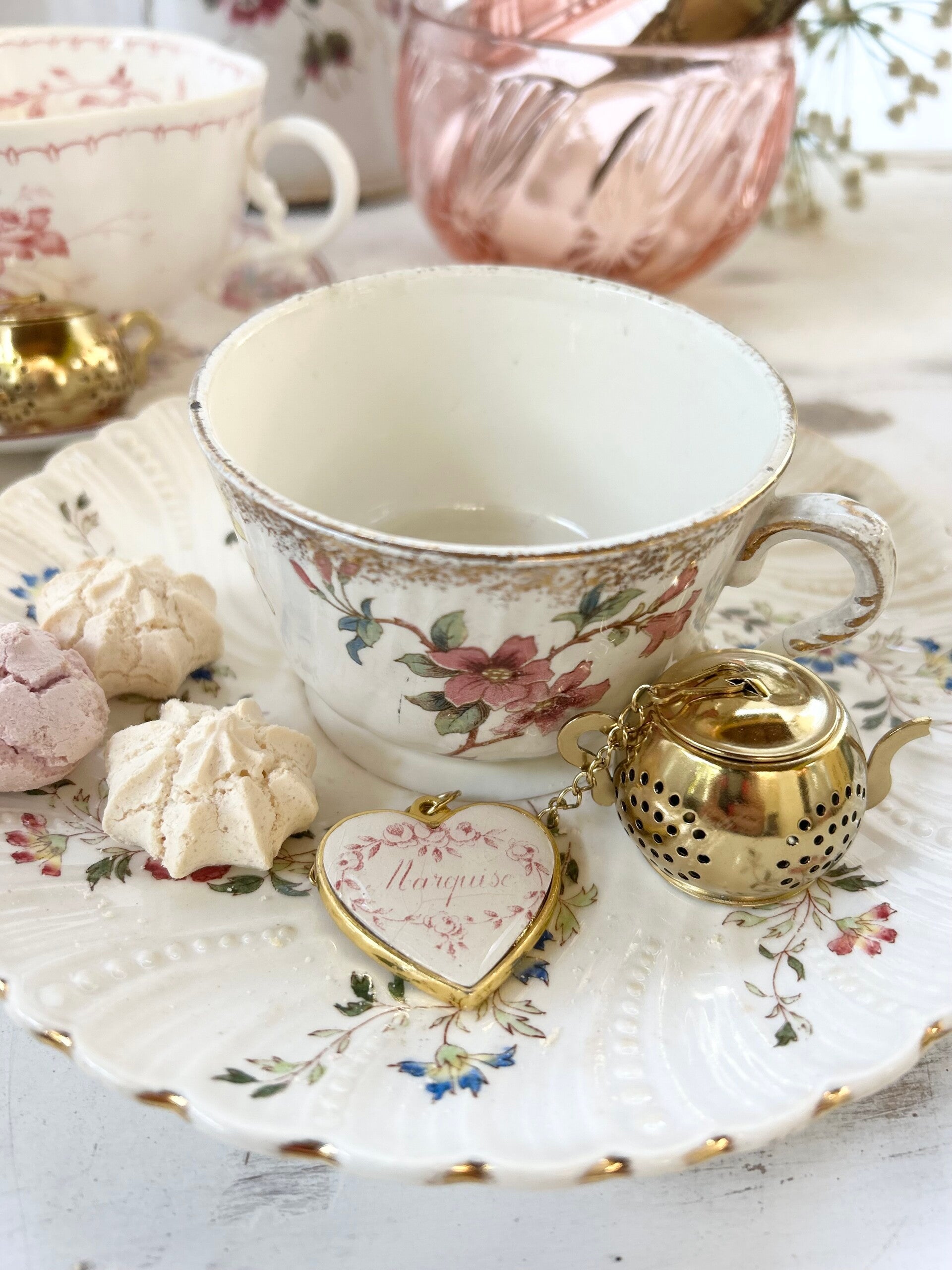 L'Infuseur doré est orné d’un médaillon en forme de cœur, réalisé à la main à partir d’un fragment d’assiette ancienne en terre de fer modèle Marquise
