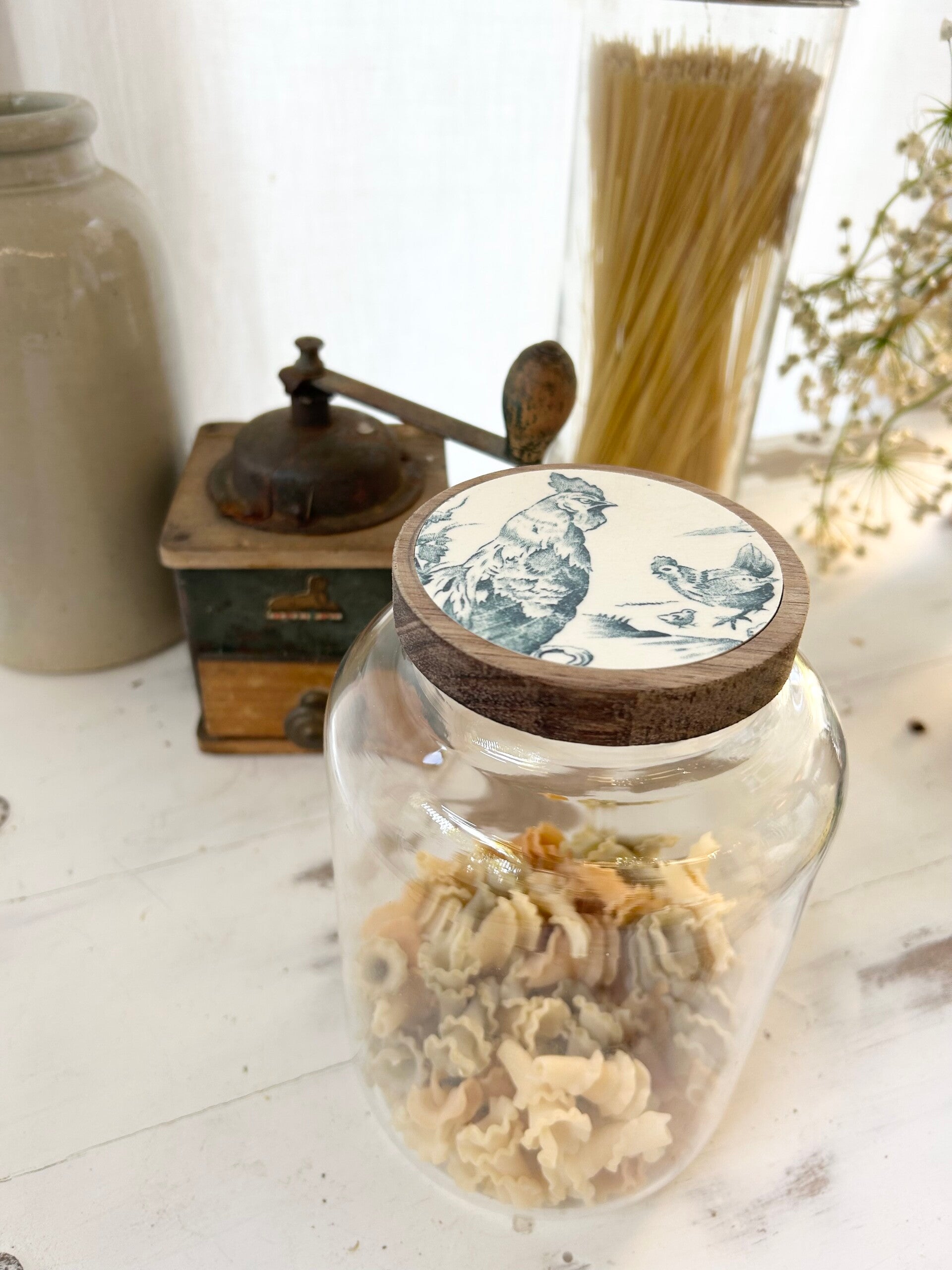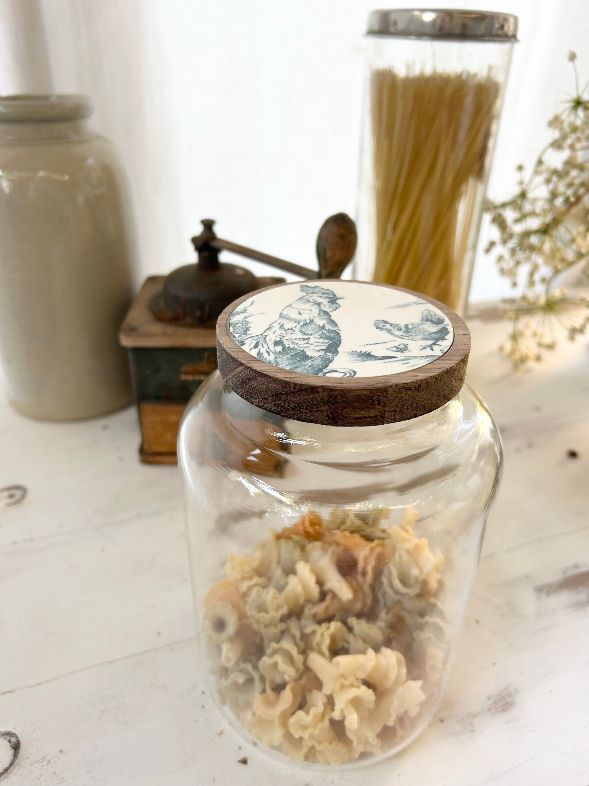 Pot de conservation en verre, agrémenté de motifs de basse cours