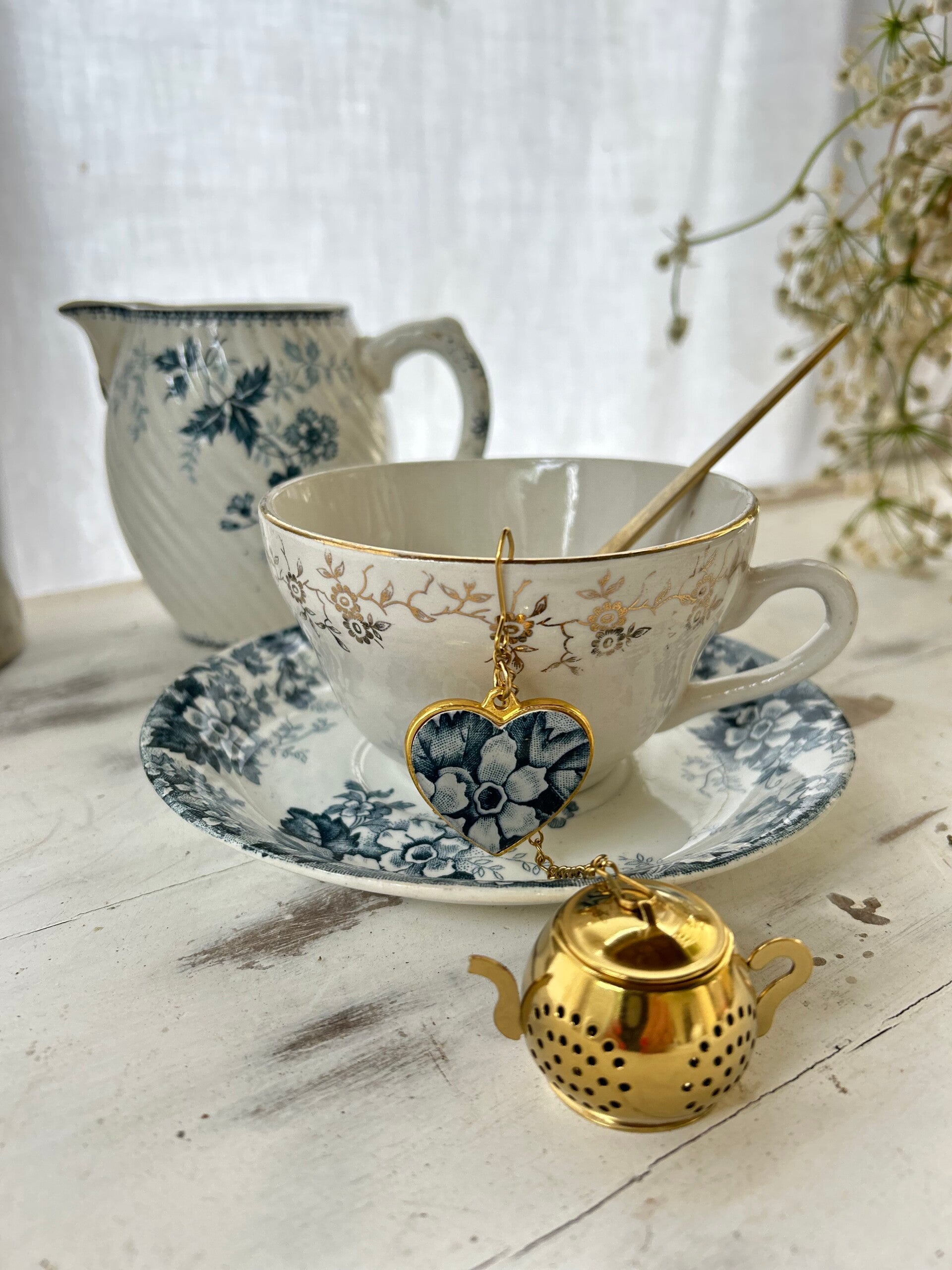 L'Infuseur doré est orné d’un médaillon en forme de cœur, réalisé à la main à partir d’un fragment d’assiette ancienne en terre de fer Saint Amand modéle Marie Louise