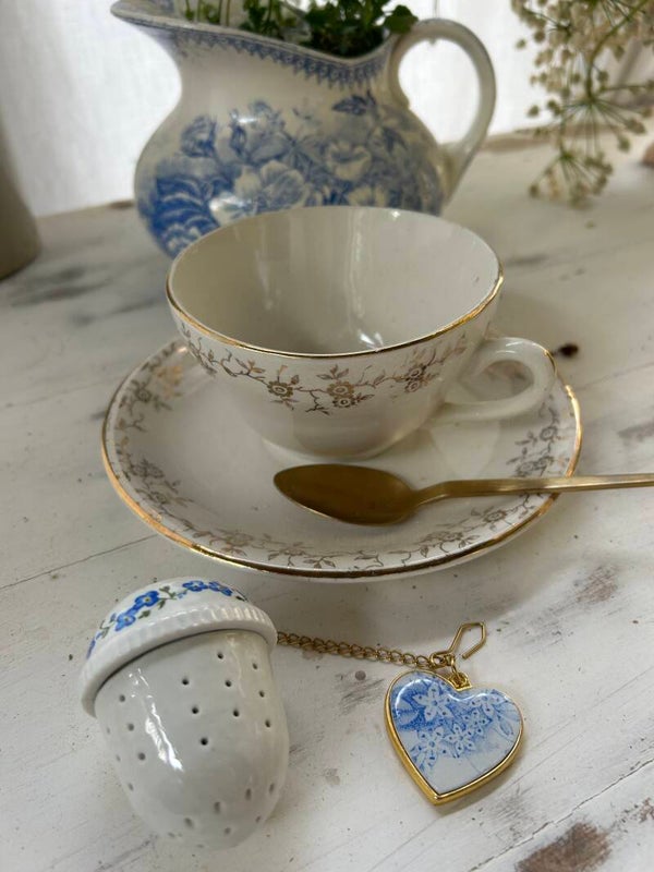 L'Infuseur en faïence blanche, parsemée de petites fleurs bleues est agrémenté d’un médaillon en forme de cœur, réalisé à la main à partir d’un fragment d’assiette ancienne en terre de fer Saint Amand modèle Caifa