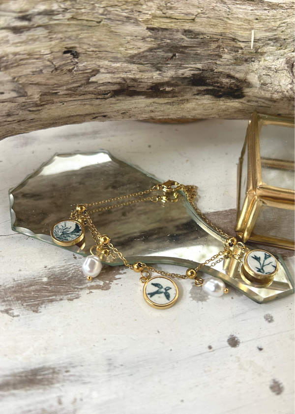 Chaque breloque est unique, montée sur une chaîne dorée. Une des breloques contient un oiseau. Il est complété par deux perles blanches