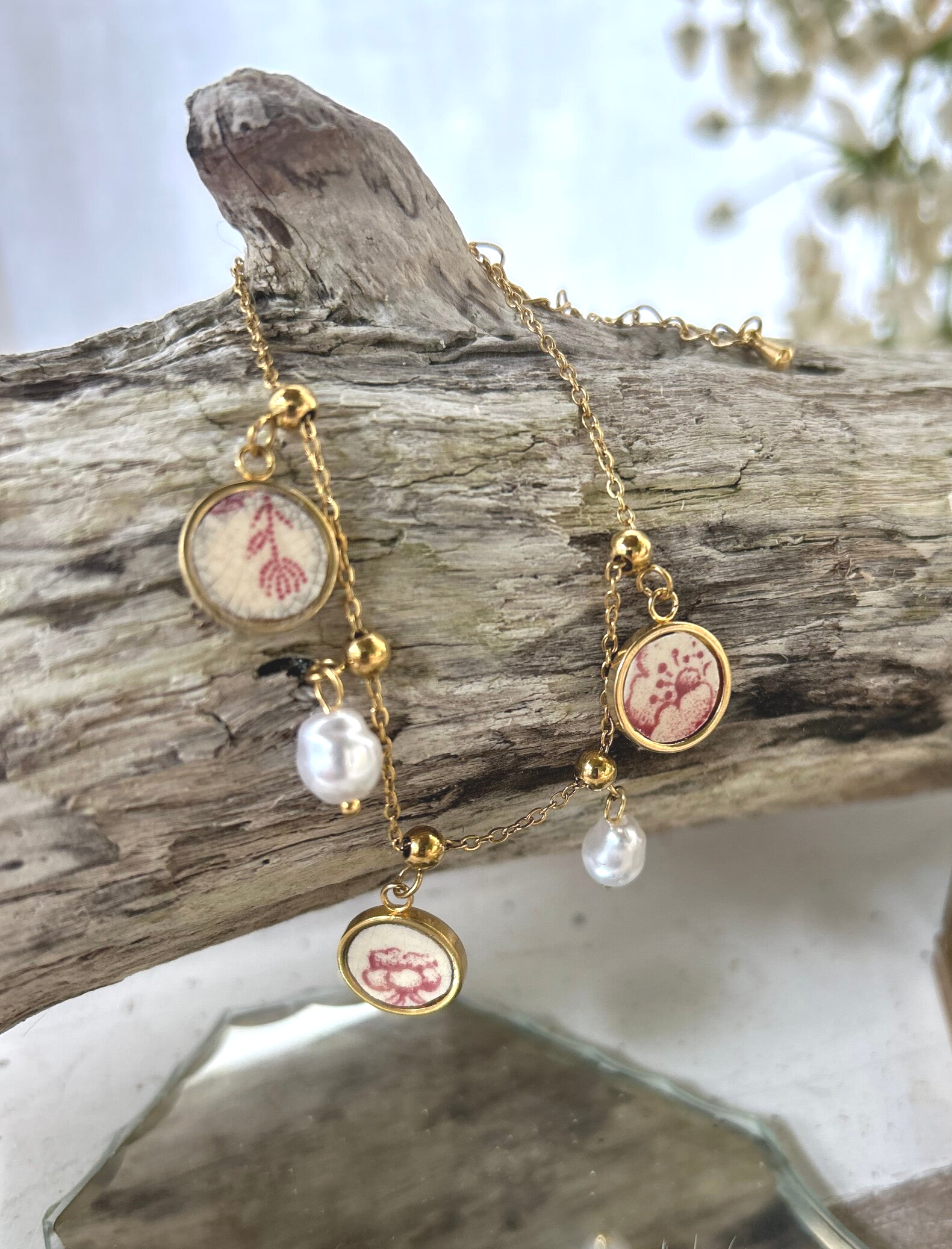 Chaque breloque est unique, montée sur une chaîne dorée. Deux perles blanches viennent rehausser le tout