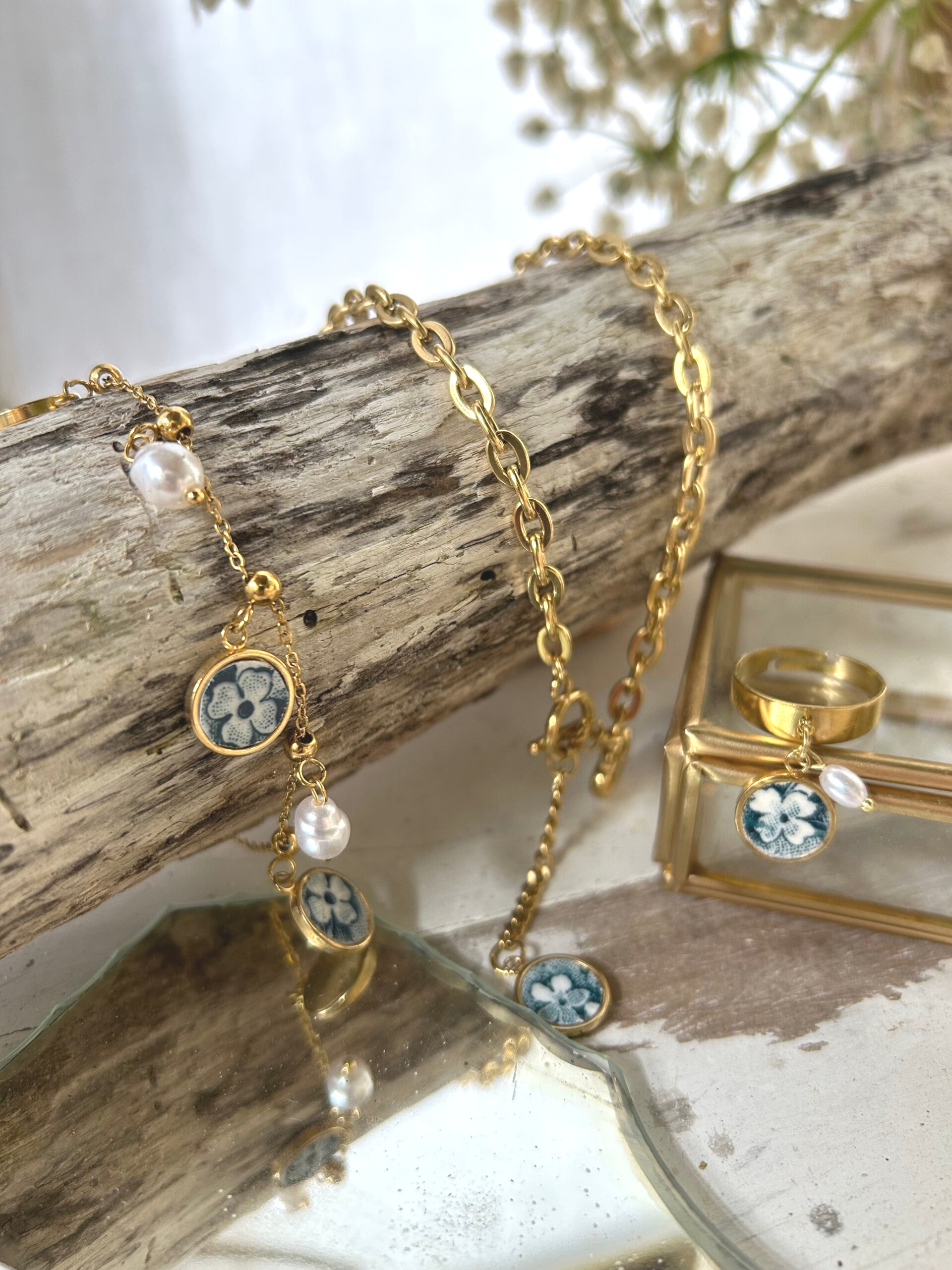 Chaque breloque est unique, montée sur une chaîne dorée. Il est complété par deux perles blanches