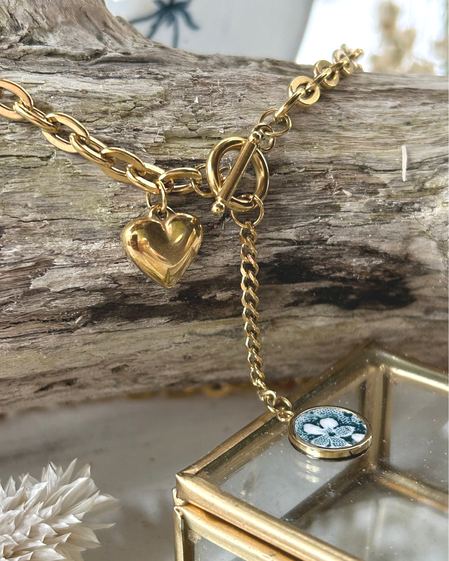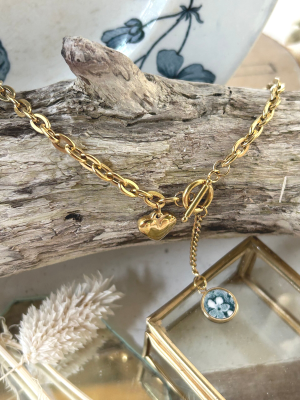 Un bijou délicat qui allie romantisme et histoire. Ce collier maille trombonne se compose d’un fermoir en T élégant, d’un petit pendentif cœur doré et d’un médaillon unique, orné d’un cabochon taillé à la main dans une authentique assiette en faïence Terre de Fer Marie Louise