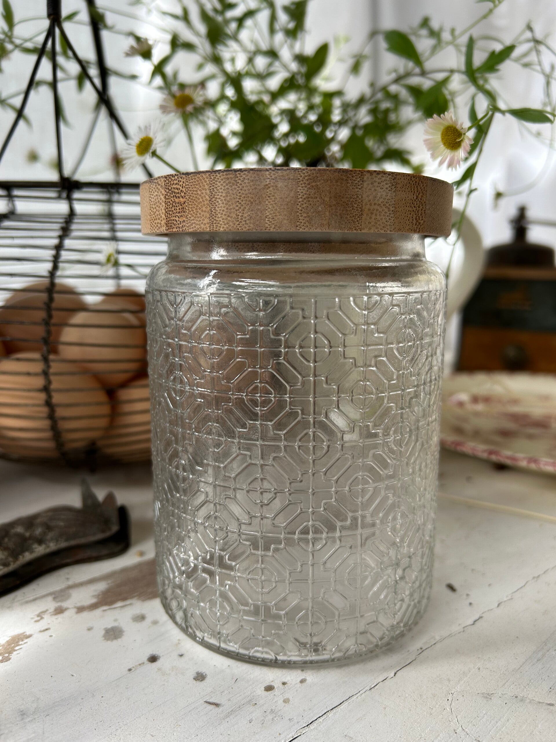 Pots de conservation en verre à relief, agrémenté de fleurs de fushia.