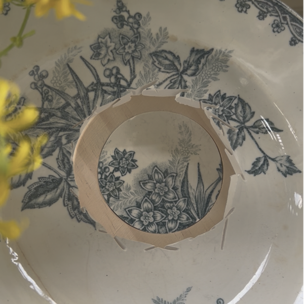 Couvercle en bois hermétique, rehaussé d’un fragment d’assiette terre de fer Saint Amand , modèle Margot