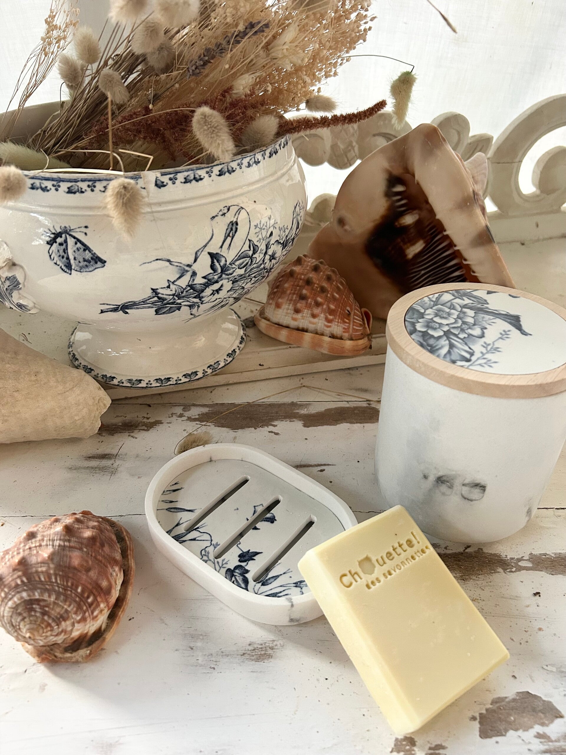 plongez dans un univers délicatement rétro avec cet ensemble salle de bain réalisé à partir d'une assiette Carmen de chez Sarreguemines
