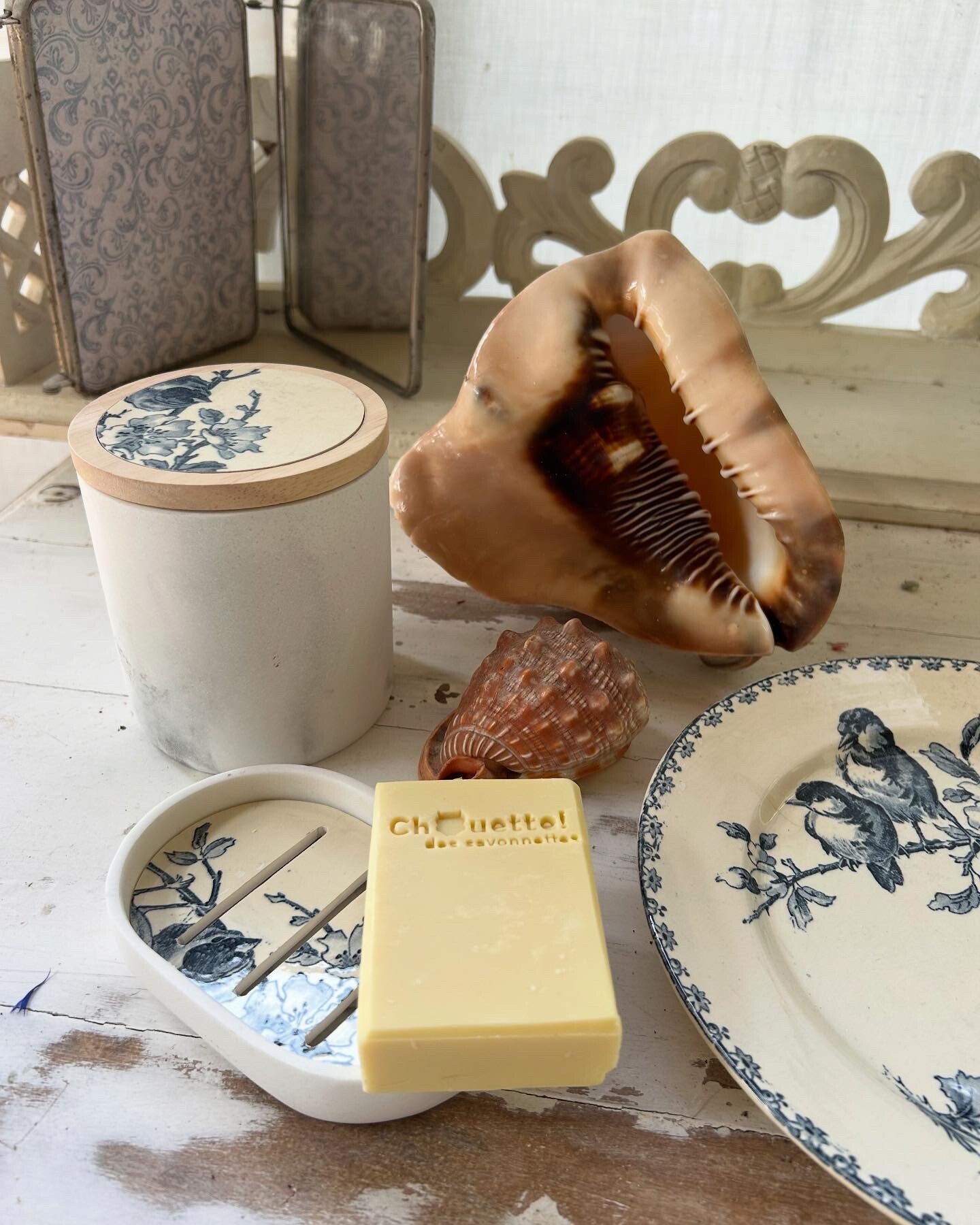plongez dans un univers délicatement rétro avec cet ensemble salle de bain réalisé à partir d'une assiette Favori de chez Sarreguemines