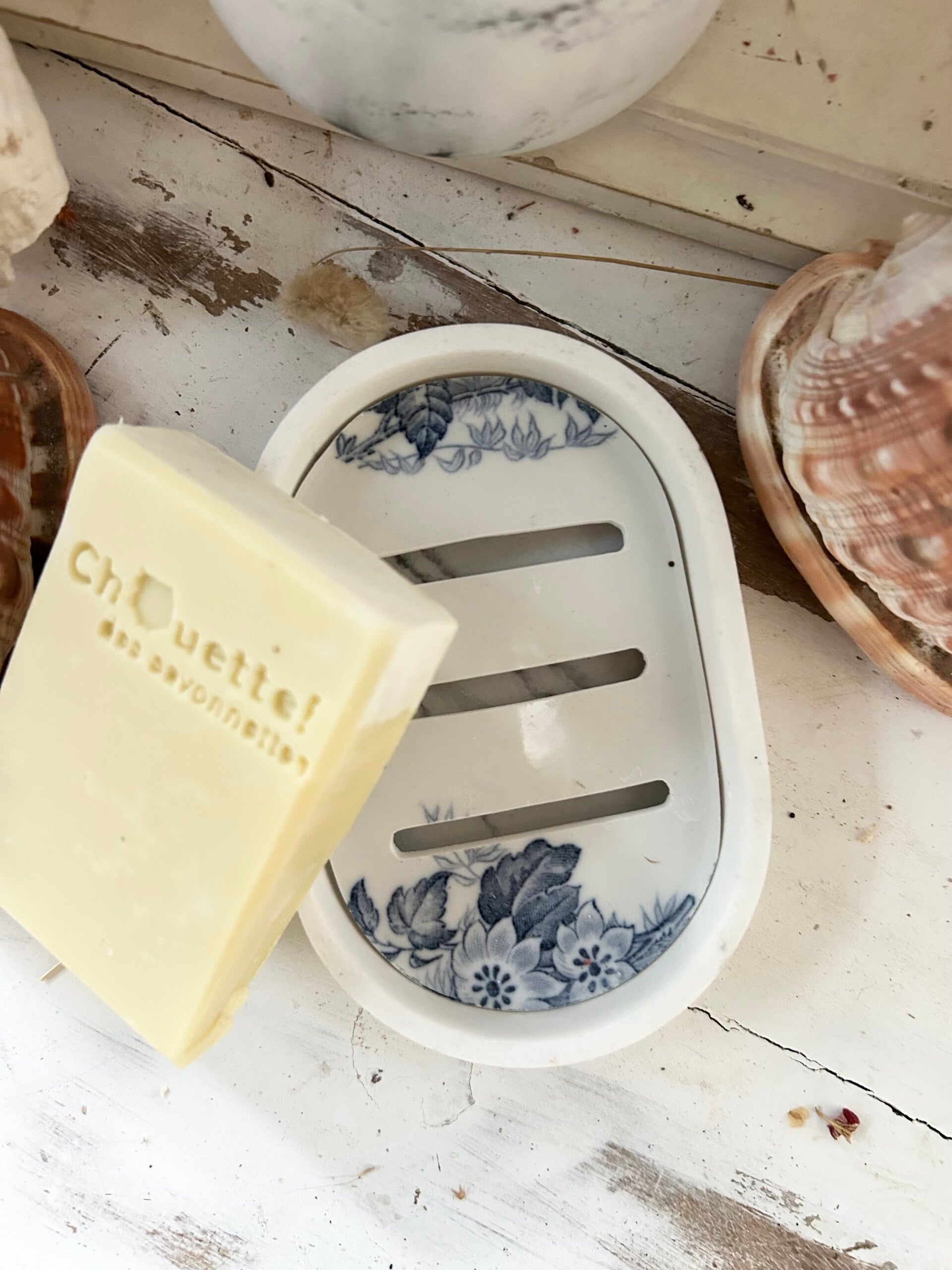 Aspect marbre et un morceau d'assiette ajourée pour laisser égoutter le savon