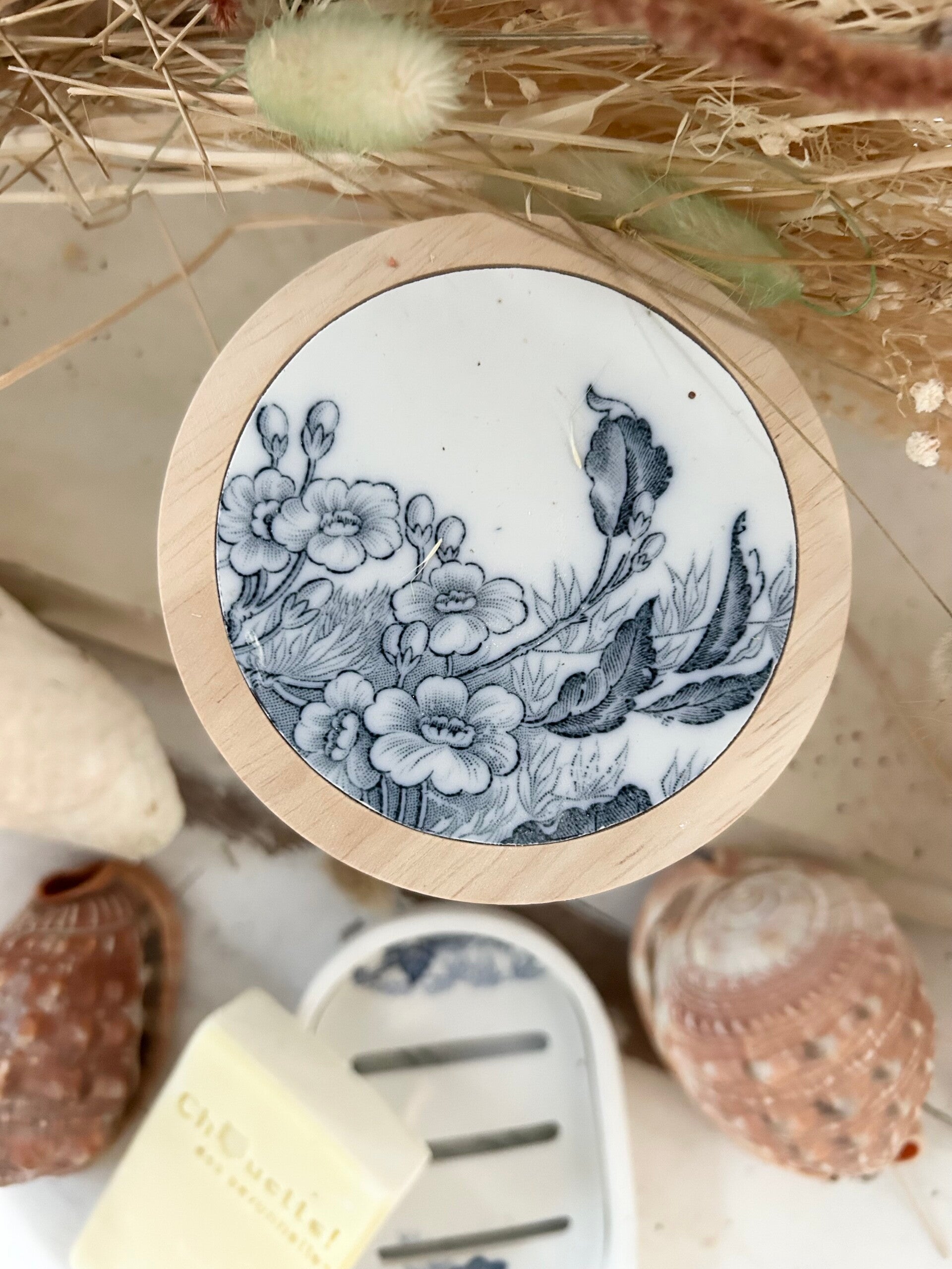 Aspect marbre. Couvercle en bambou orné d'un fragment d'assiette