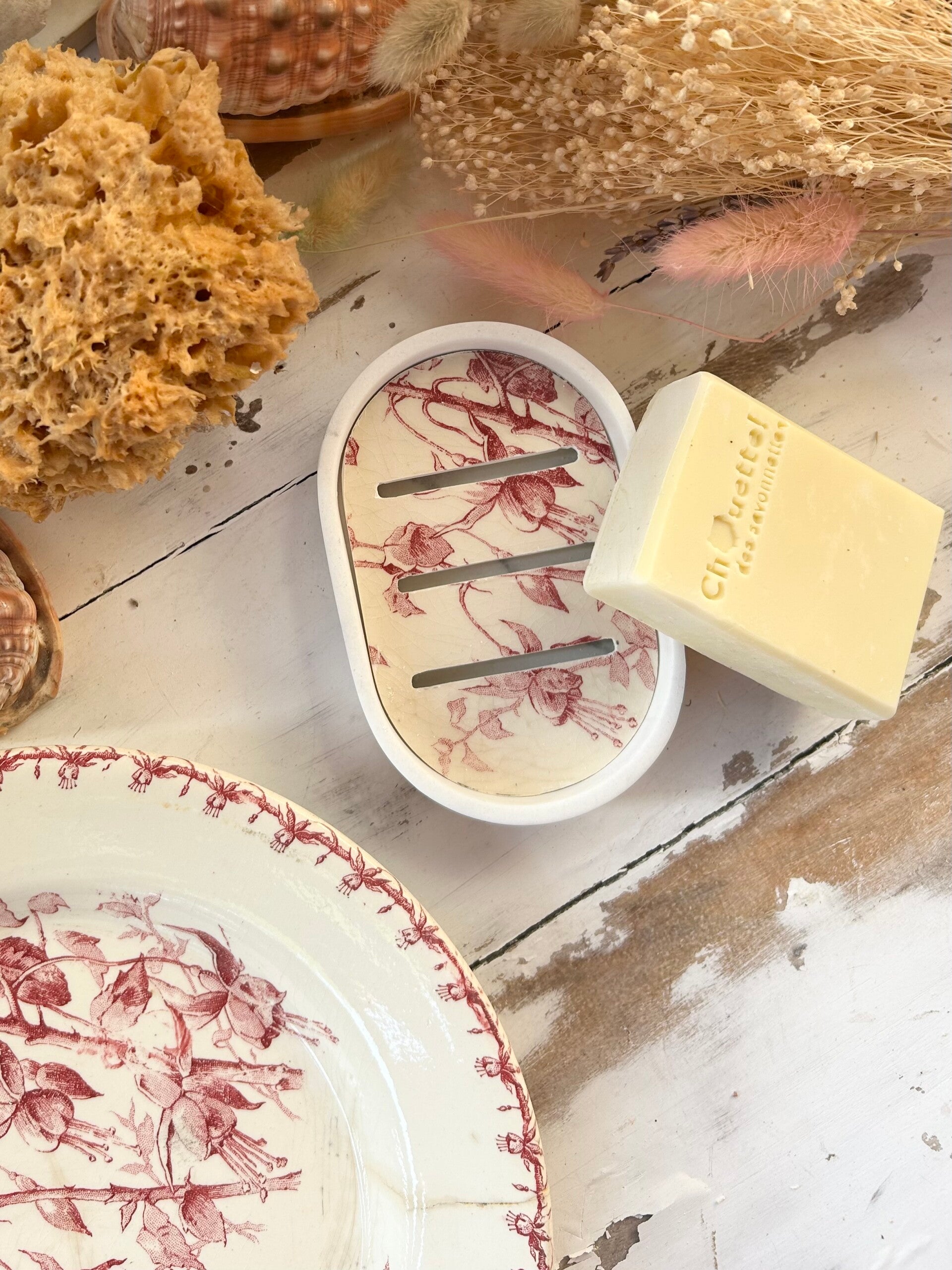 Porte savon au style délicieusement rétro. Sa base effet marbre blanc met en valeur un délicat fragment d'assiette terre de fer Gien modéle fushia, aux teintes framboise et motifs floraux romantiques