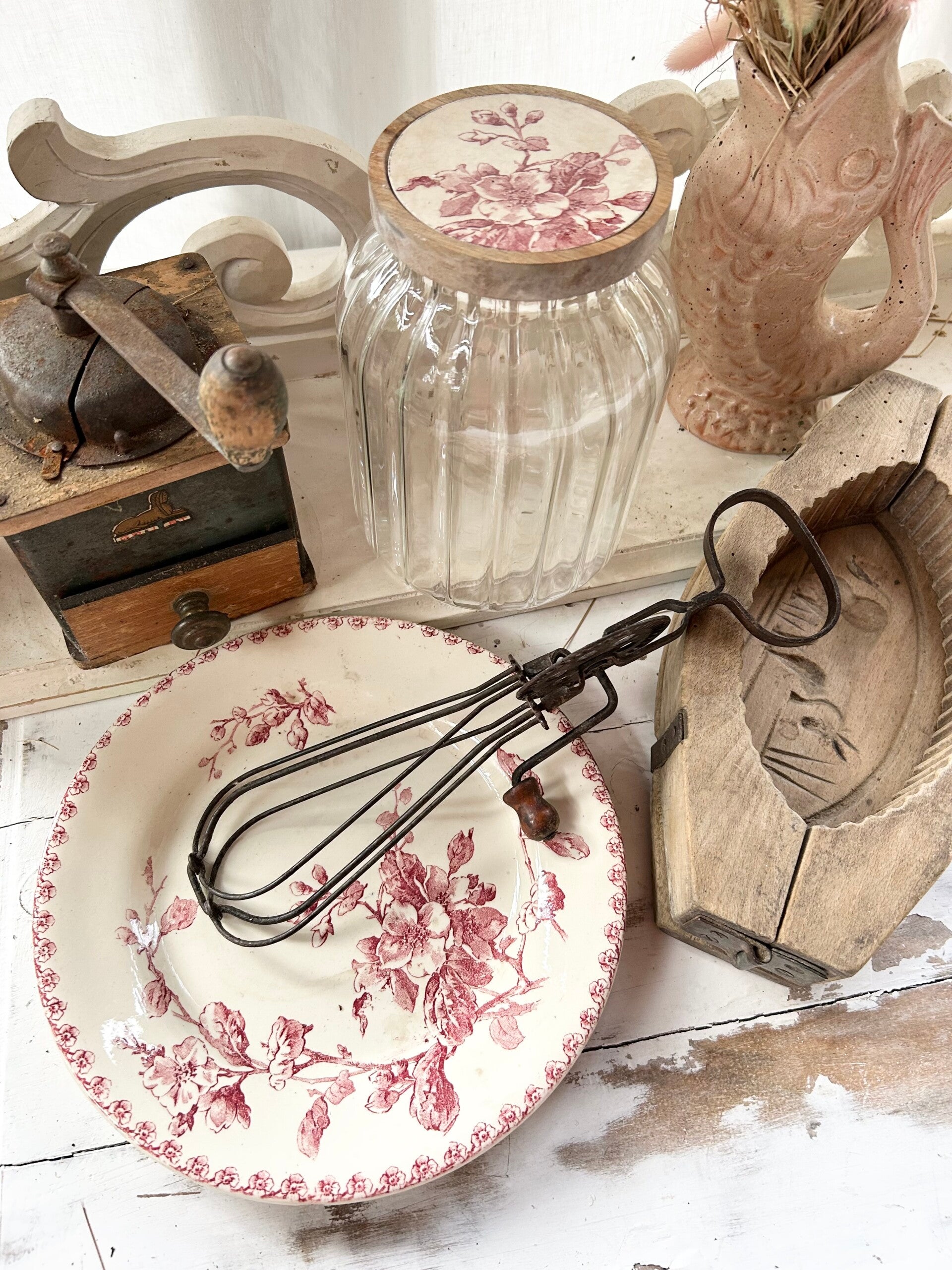Couvercle hermétique en bois, rehaussé d’un fragment d’assiette terre de fer Gien , modèle fleurs normandes