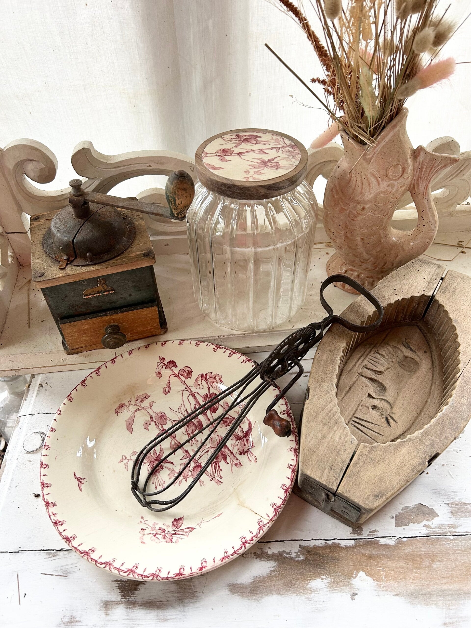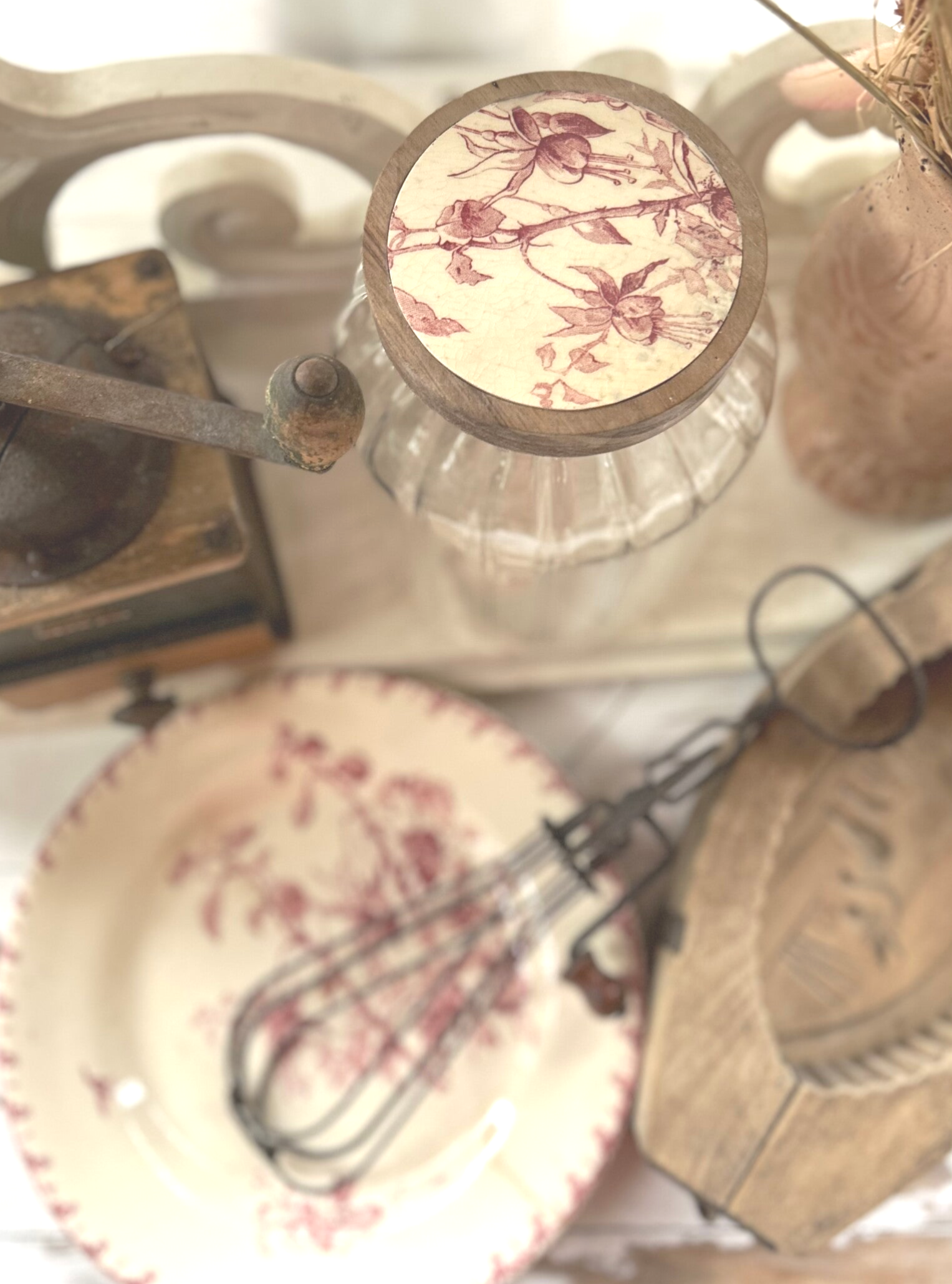 Couvercle hermétique en bois, rehaussé d’un fragment d’assiette terre de fer Gien , modèle Fushia