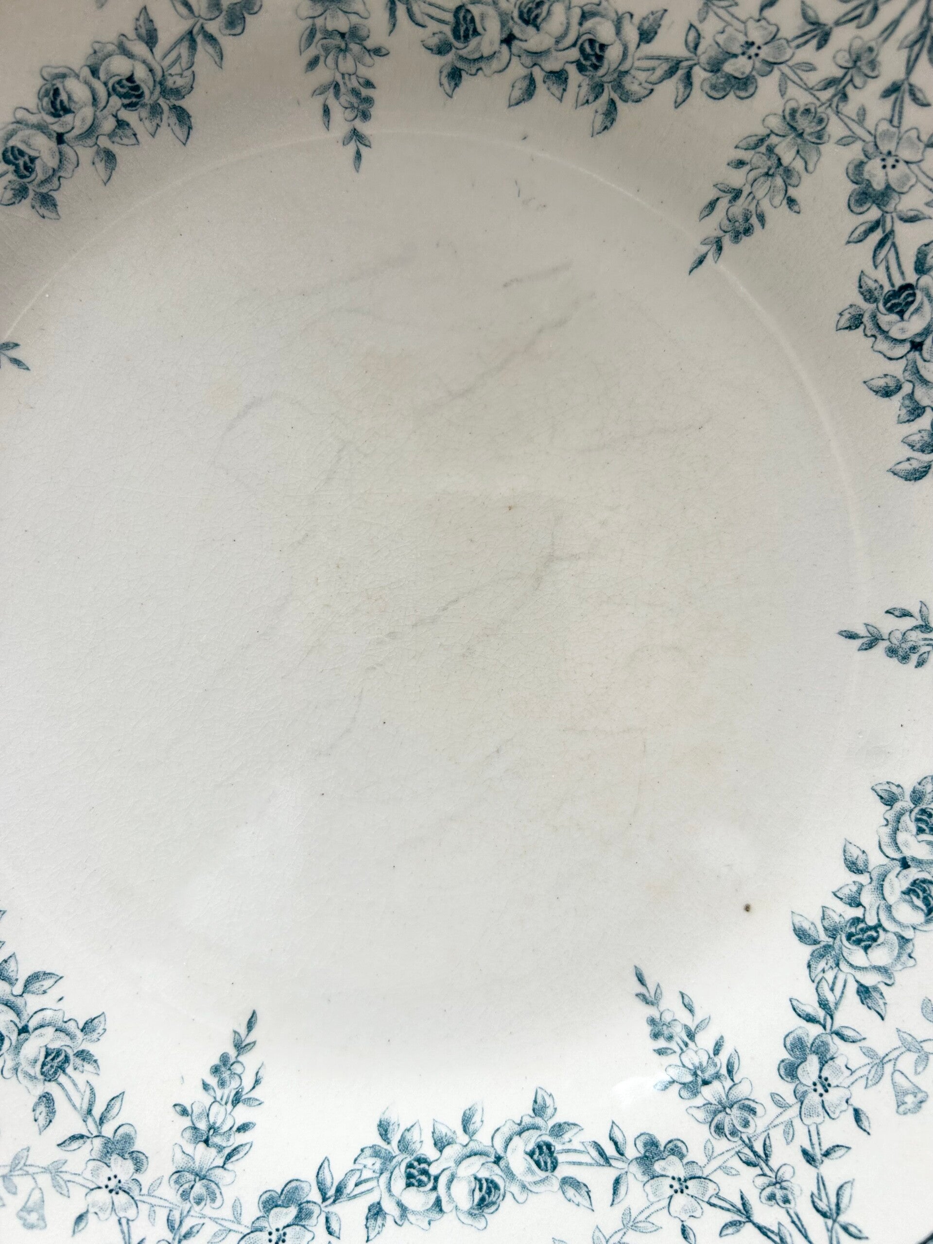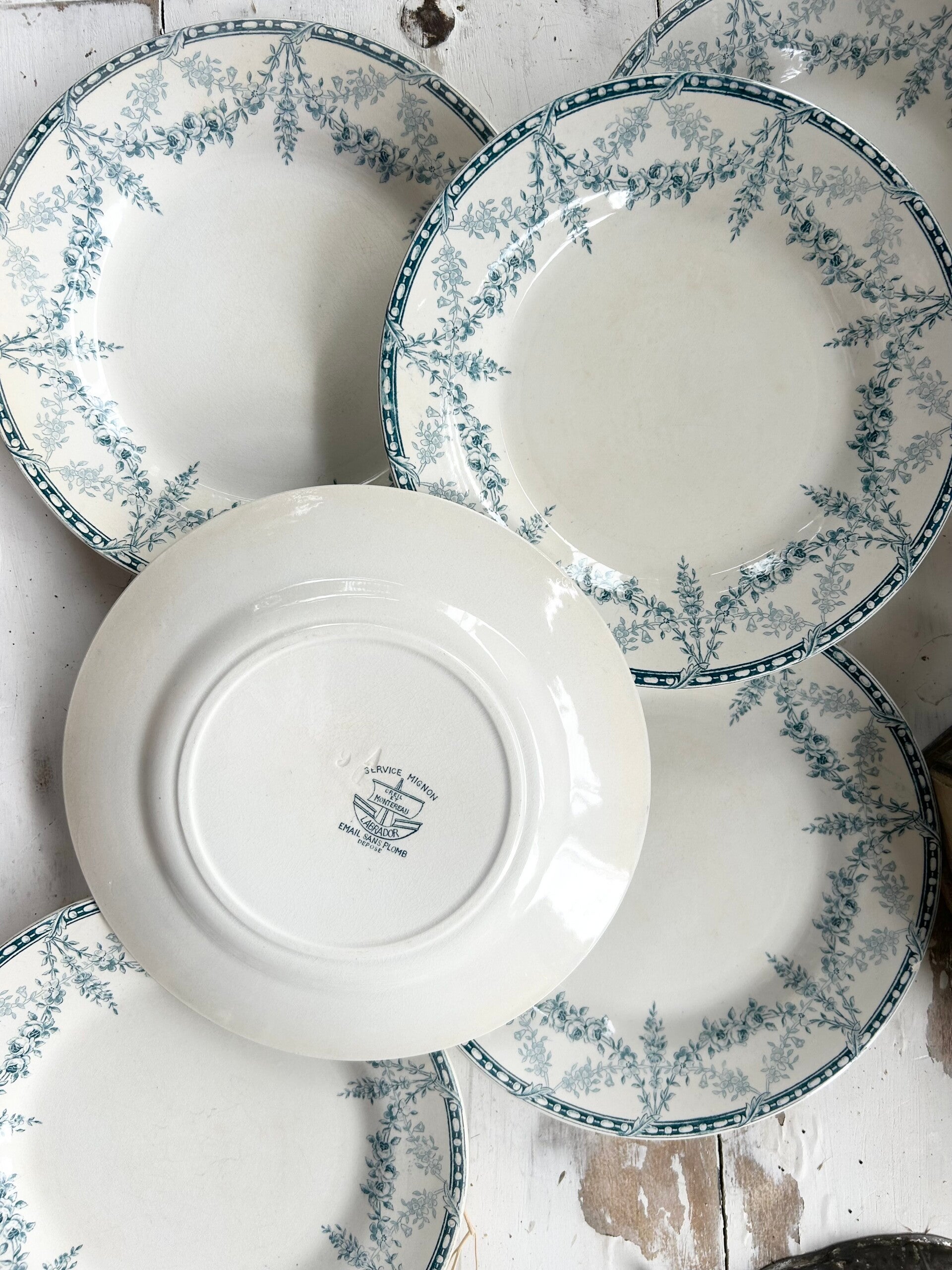 Ravissantes assiettes à dessert terre de fer de la manufacture Creil & Montereau, modèle “Mignon”. Leur décor raffiné présente une frise florale bleu-vert typique des productions du XIXe siècle ou début XXe siècle. Un modèle emblématique pour les amateurs de vaisselle ancienne française, au charme intemporel et délicat.