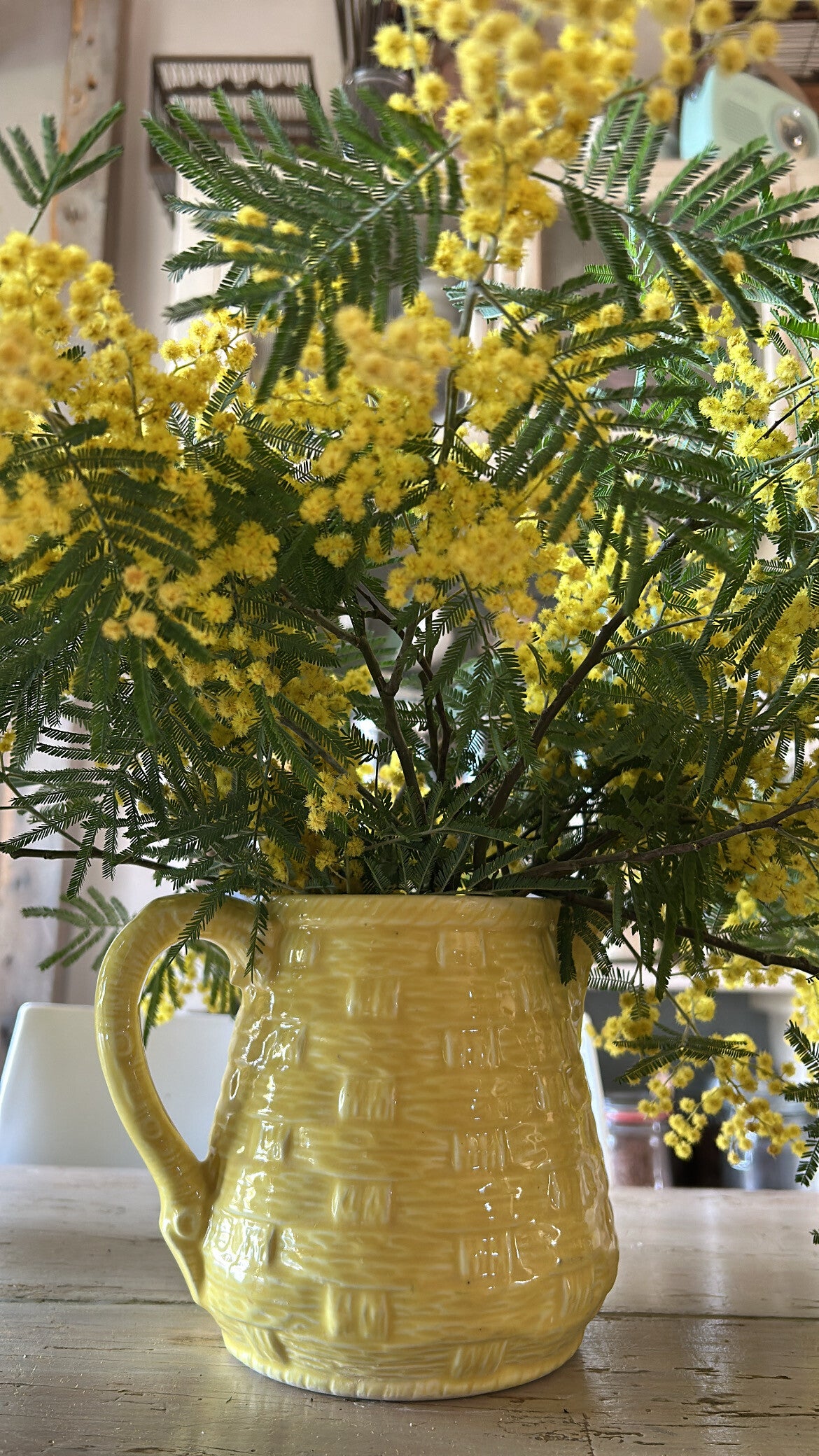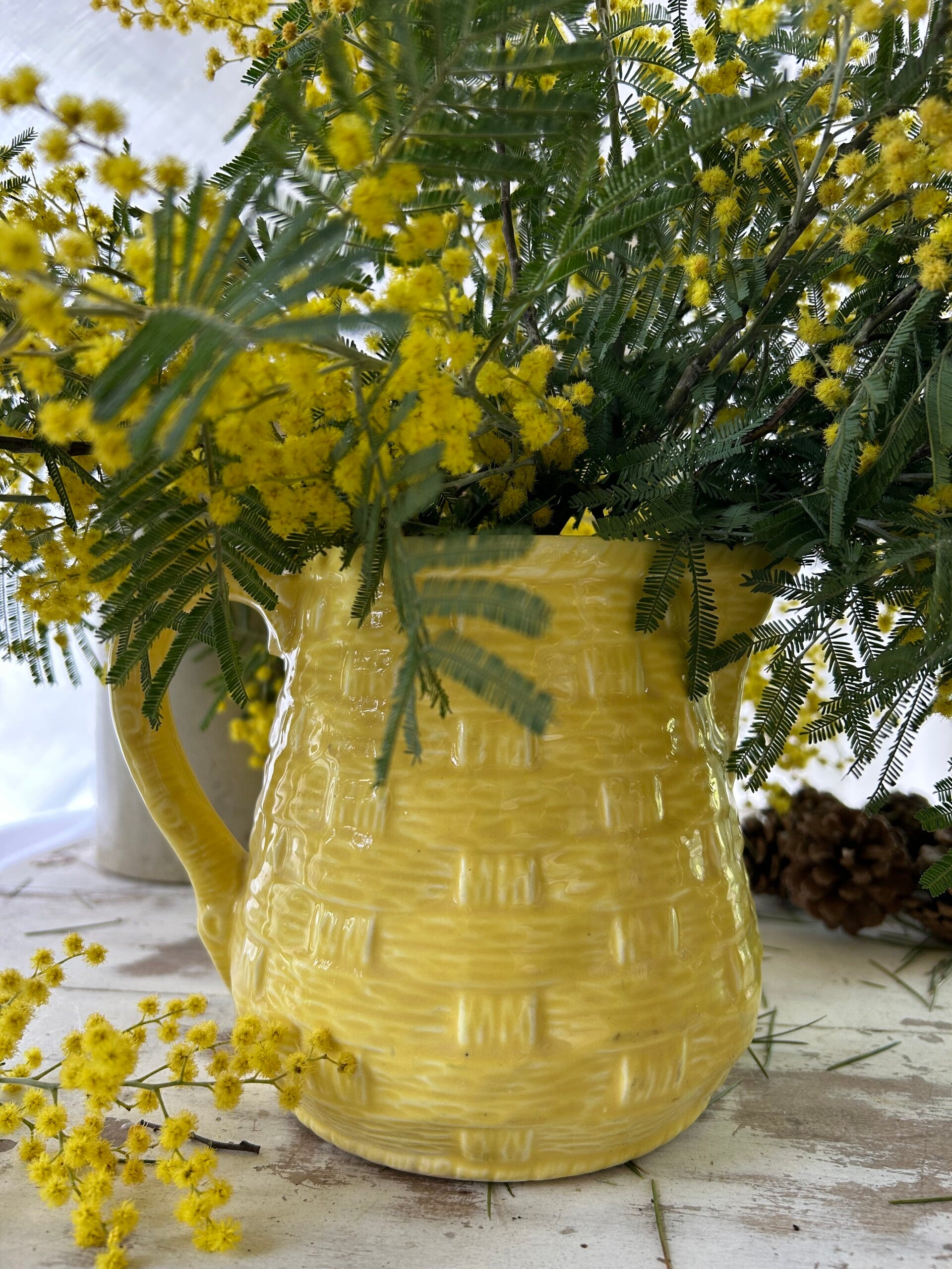 Authentique pichet en faïence de la manufacture Digoin Sarreguemines, arborant un superbe relief de panier tressé et une couleur jaune soleil éclatante. Ce modèle emblématique des années 1940-1950 mêle charme champêtre et élégance vintage. Parfait en objet déco ou en vase pour des fleurs fraîches ou séchées.