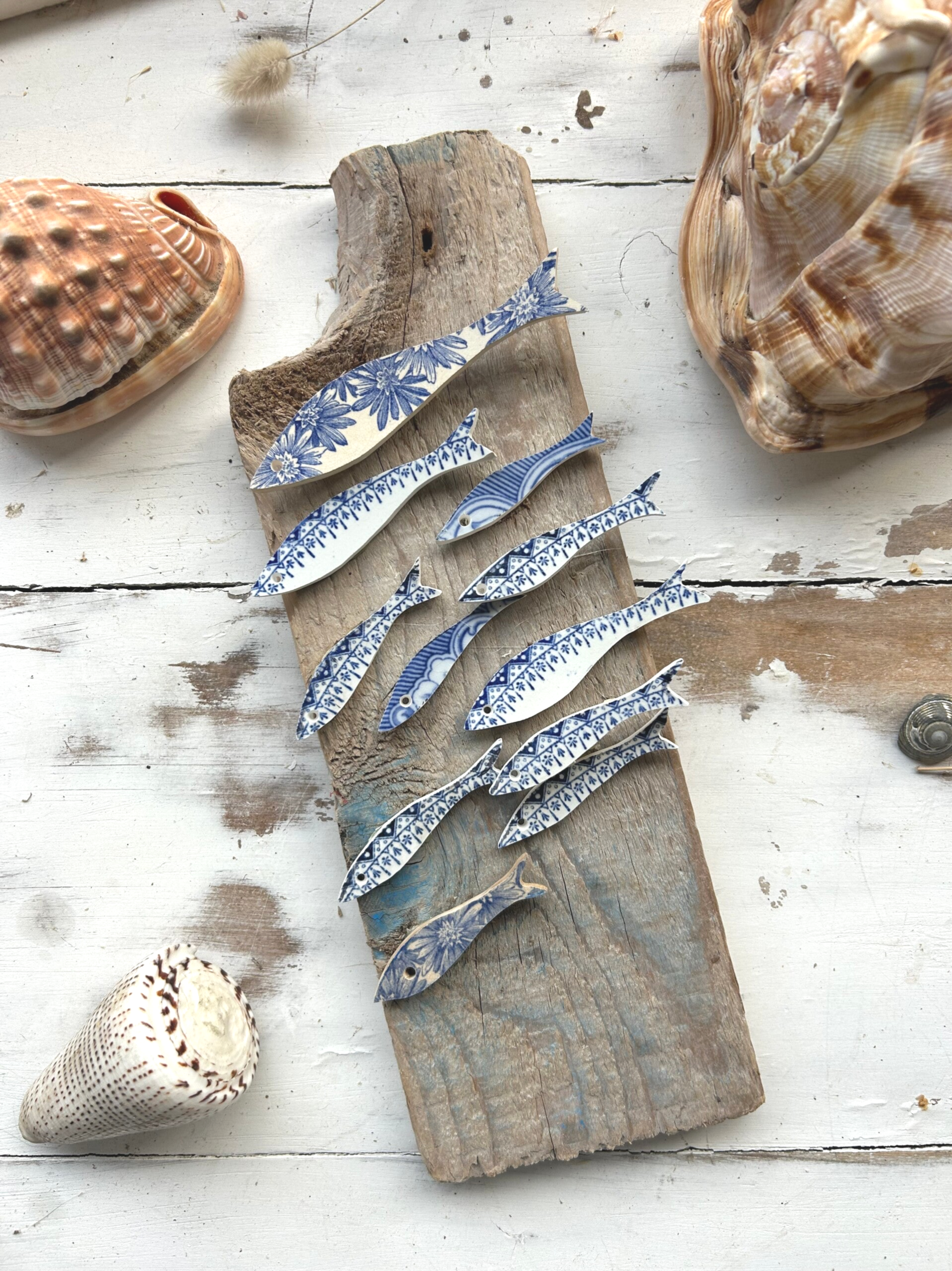 Chaque poisson est soigneusement découpé à partir d’assiettes anciennes, réemployées pour leur donner une seconde vie. Le bois flotté, avec ses nuances naturelles, apporte chaleur et authenticité à l’ensemble.