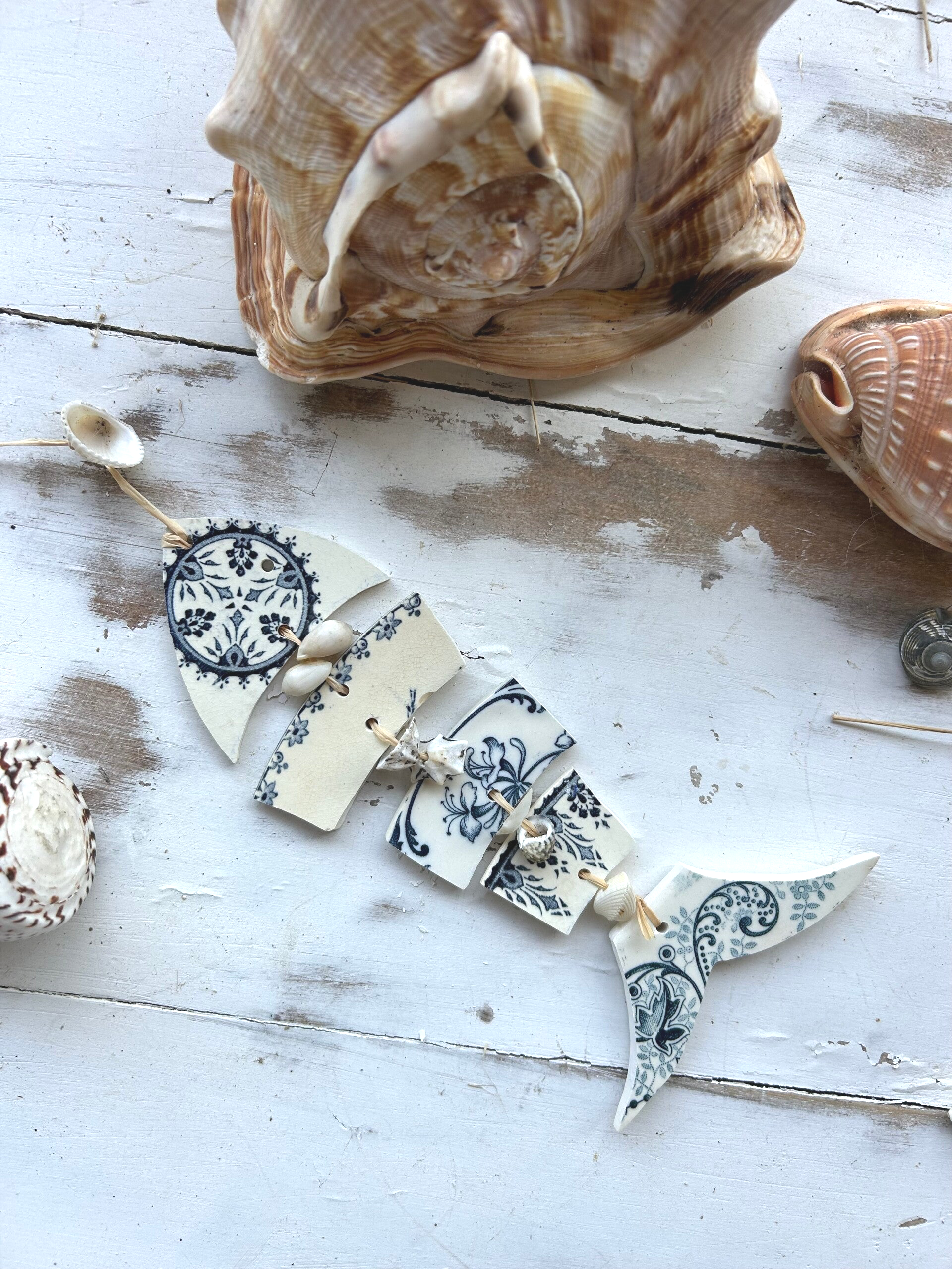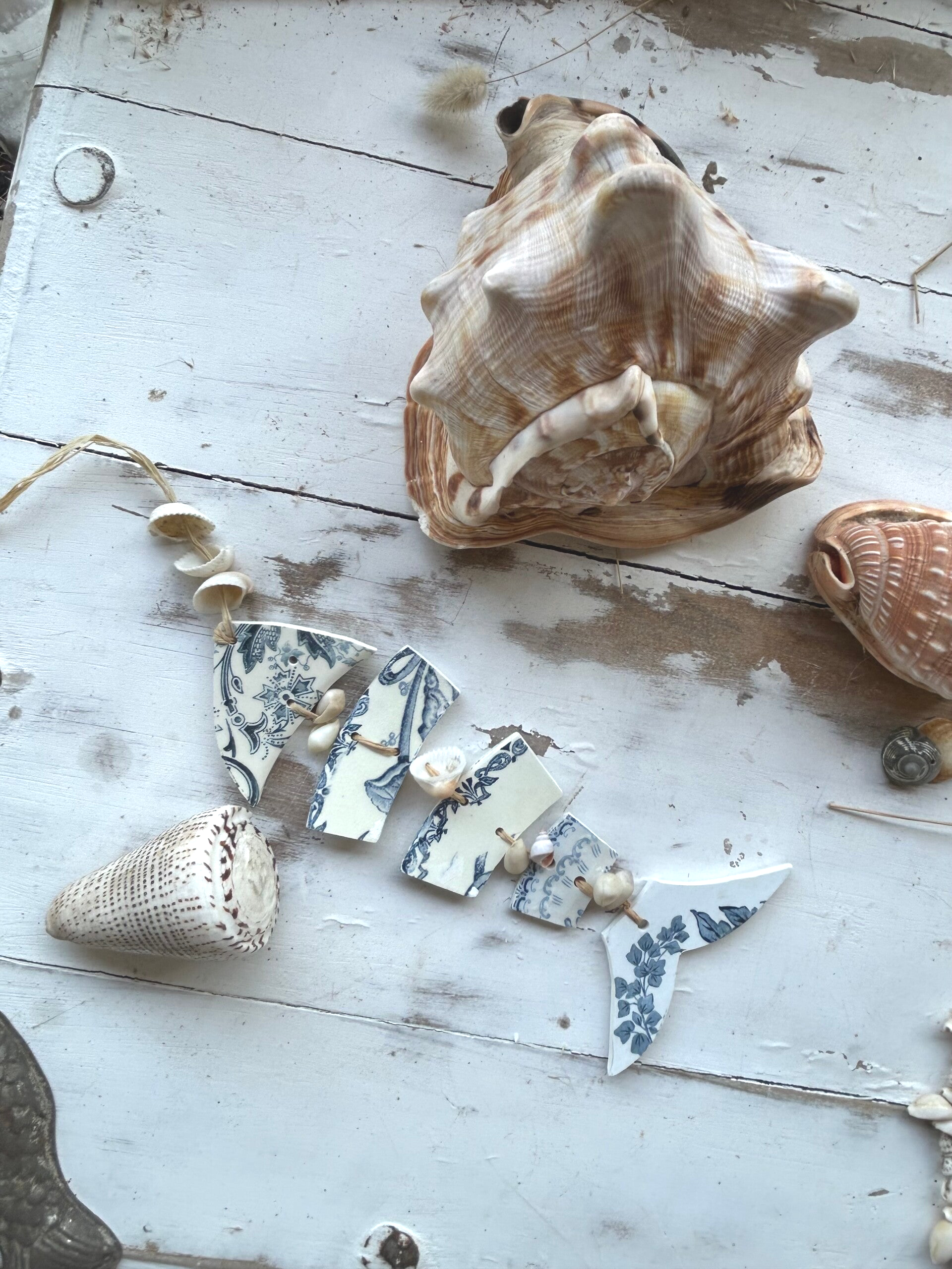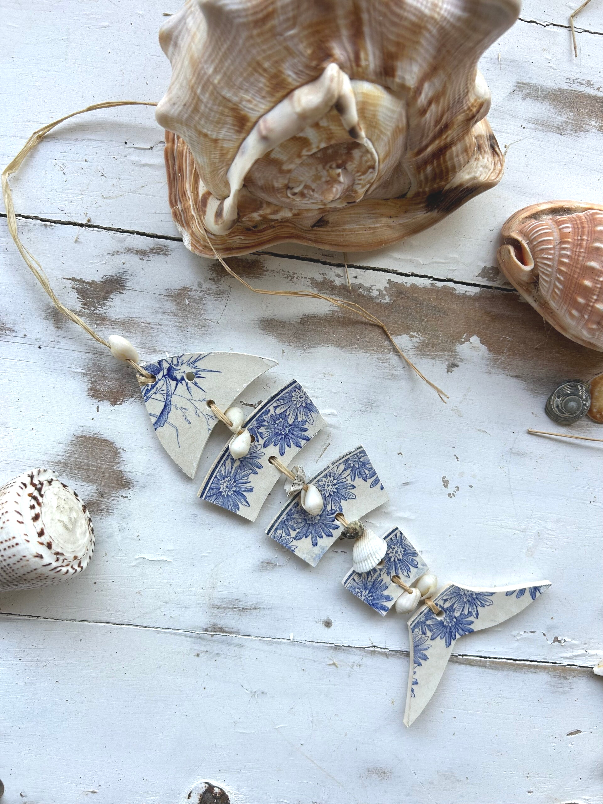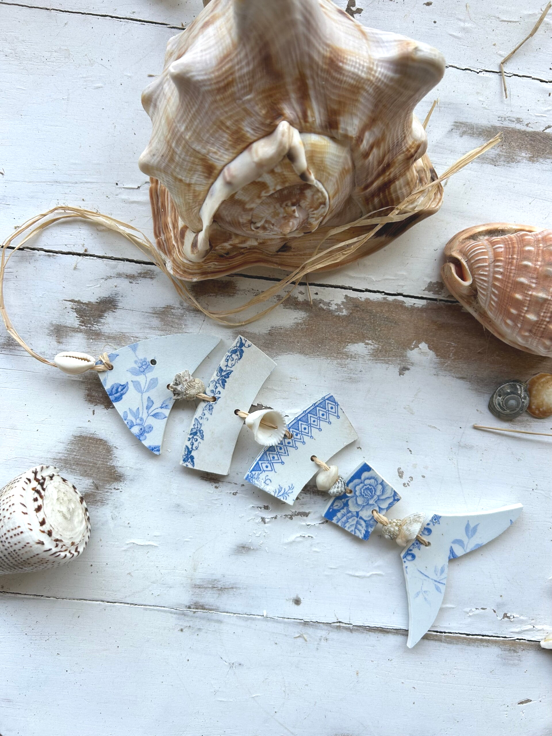 • Matière : bord d’assiettes terre de fer, raphia et coquillages