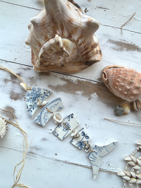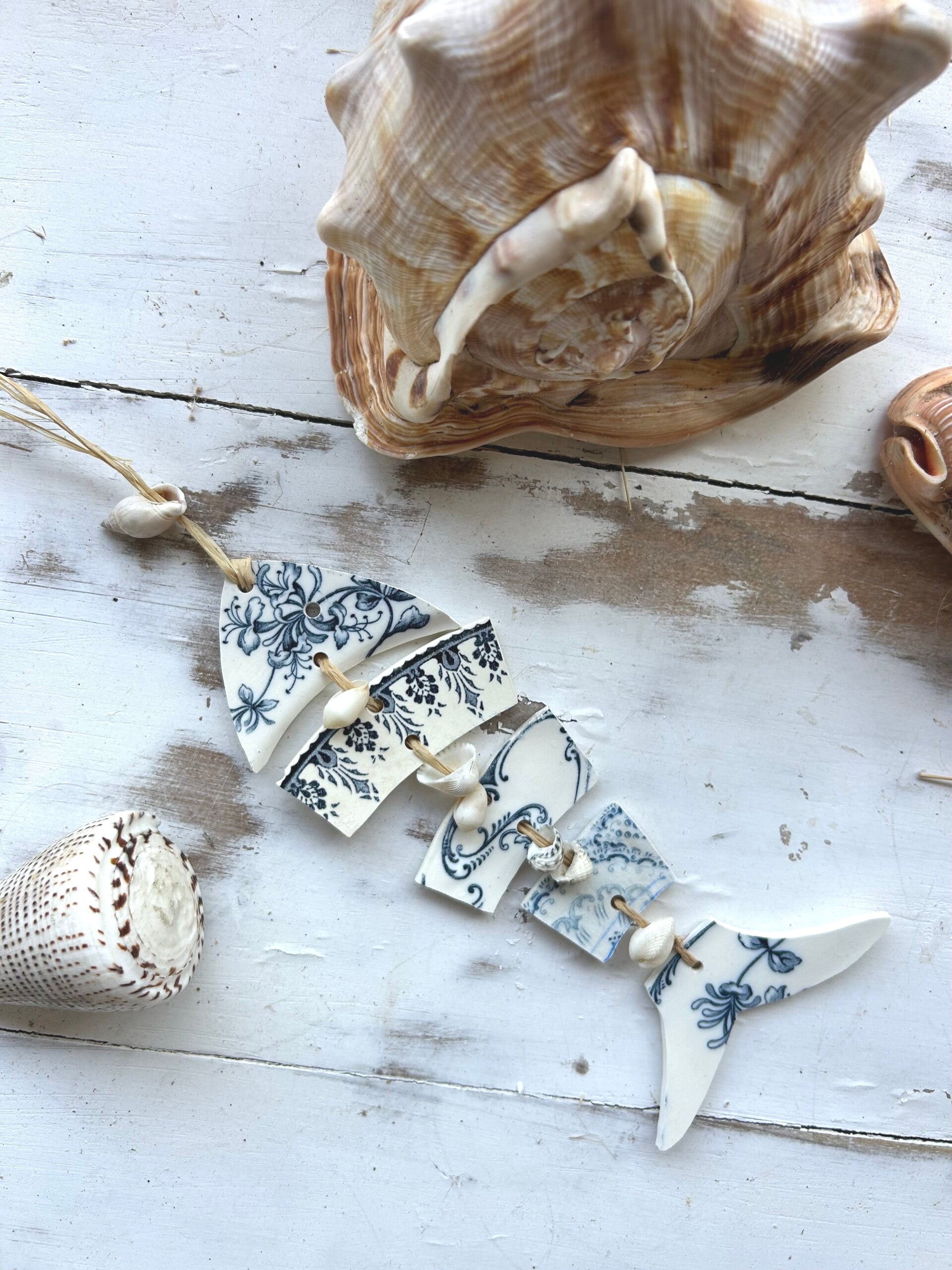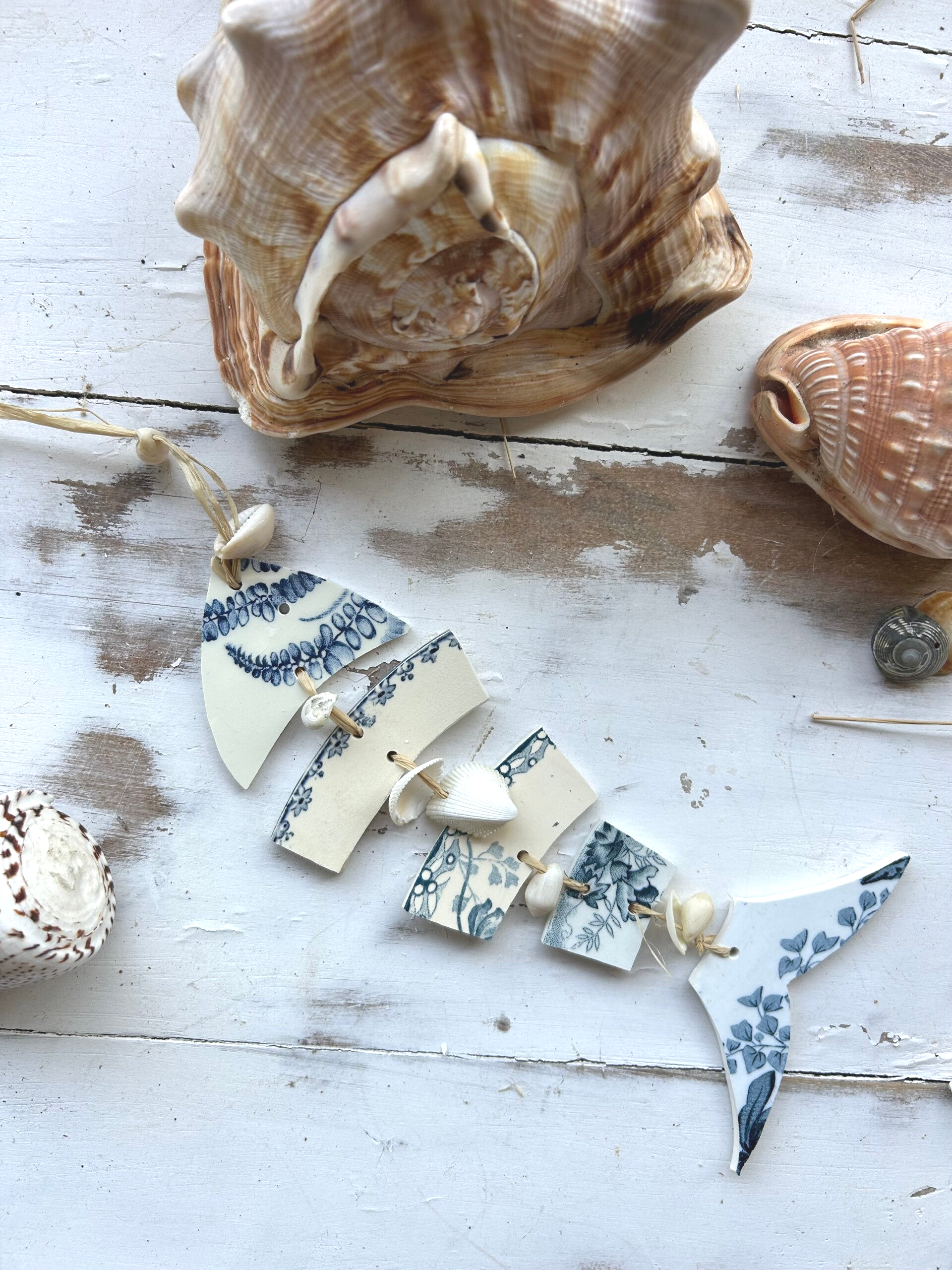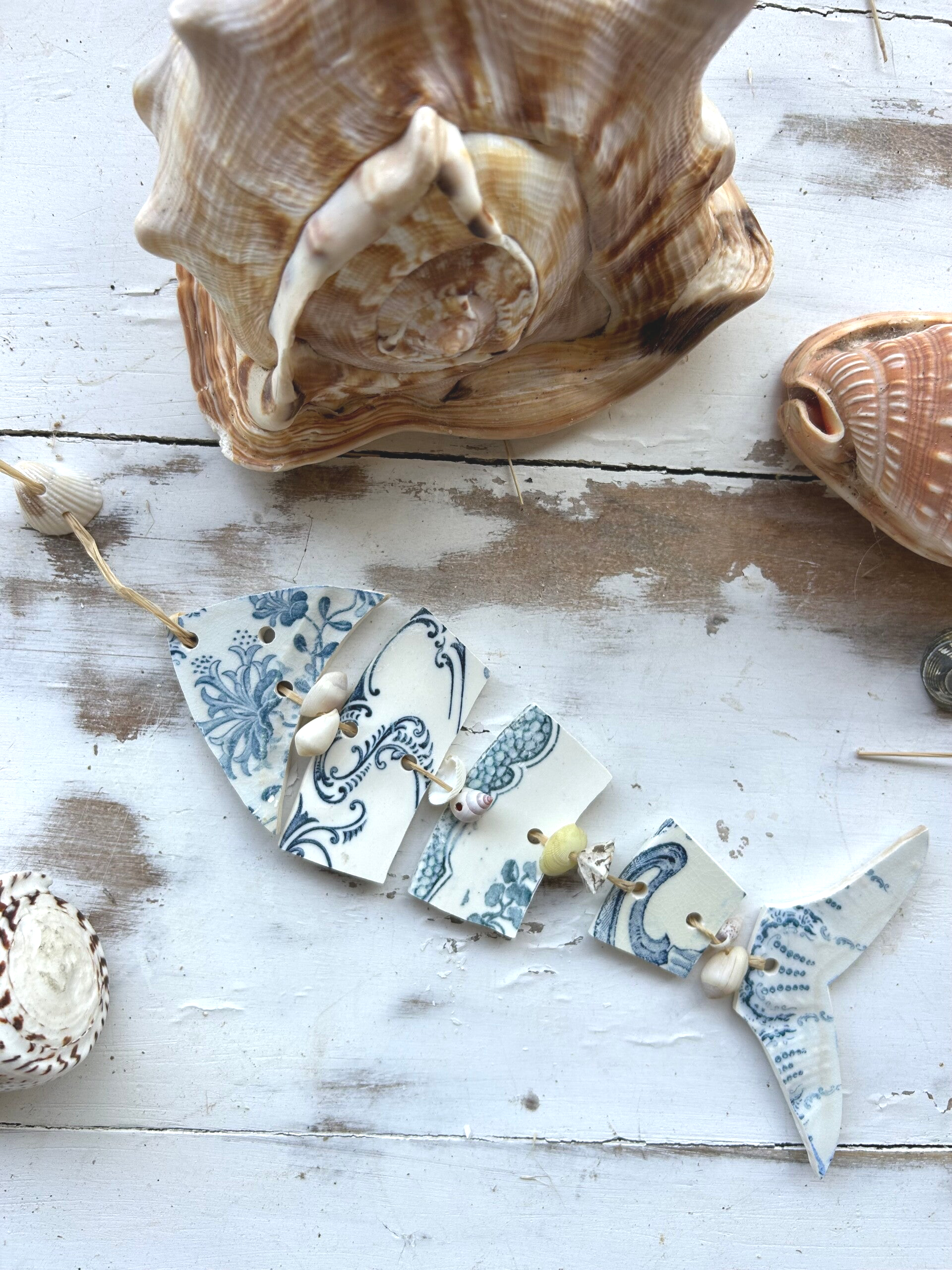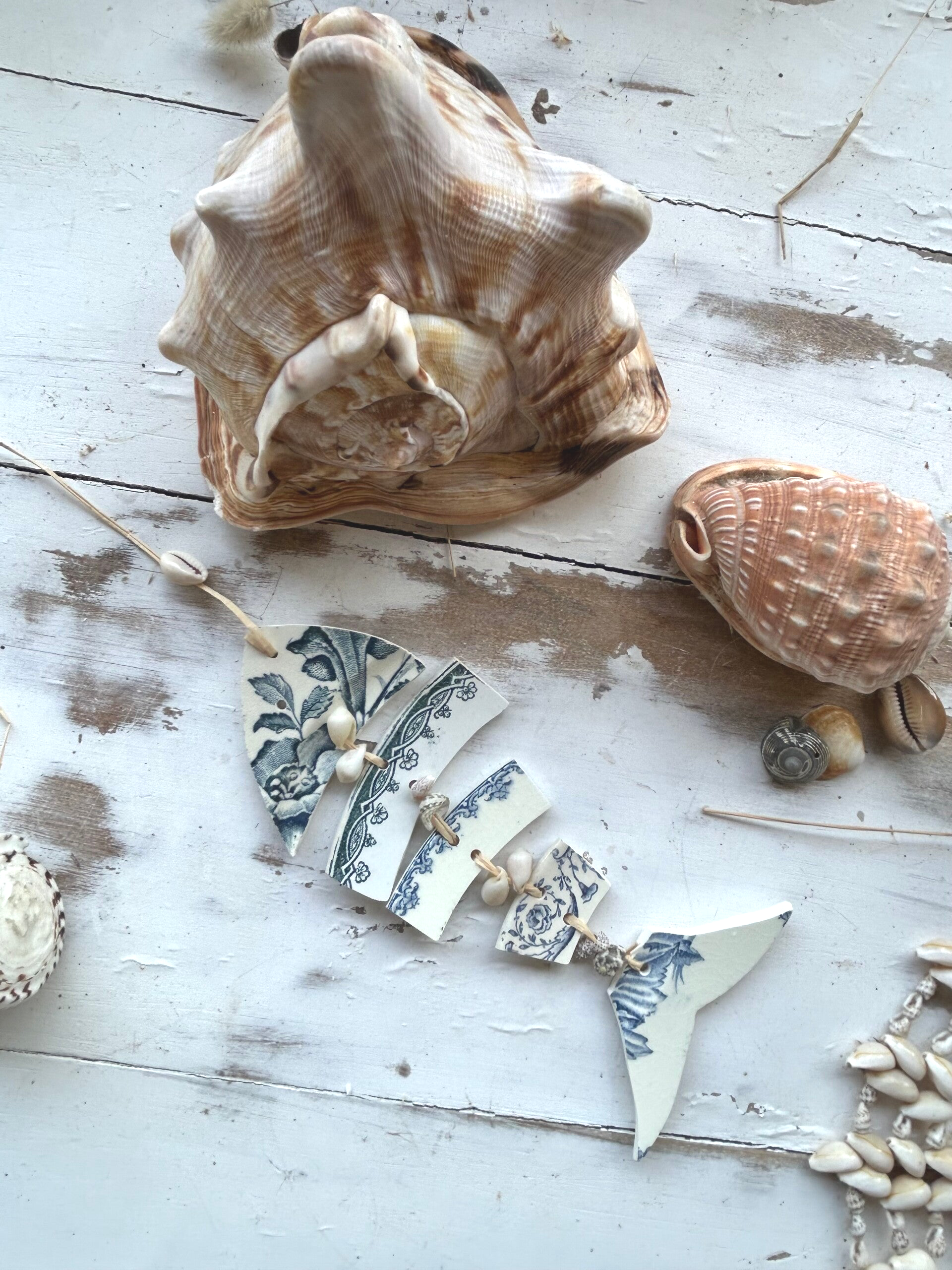 • Matière : bord d’assiettes terre de fer, raphia et coquillages