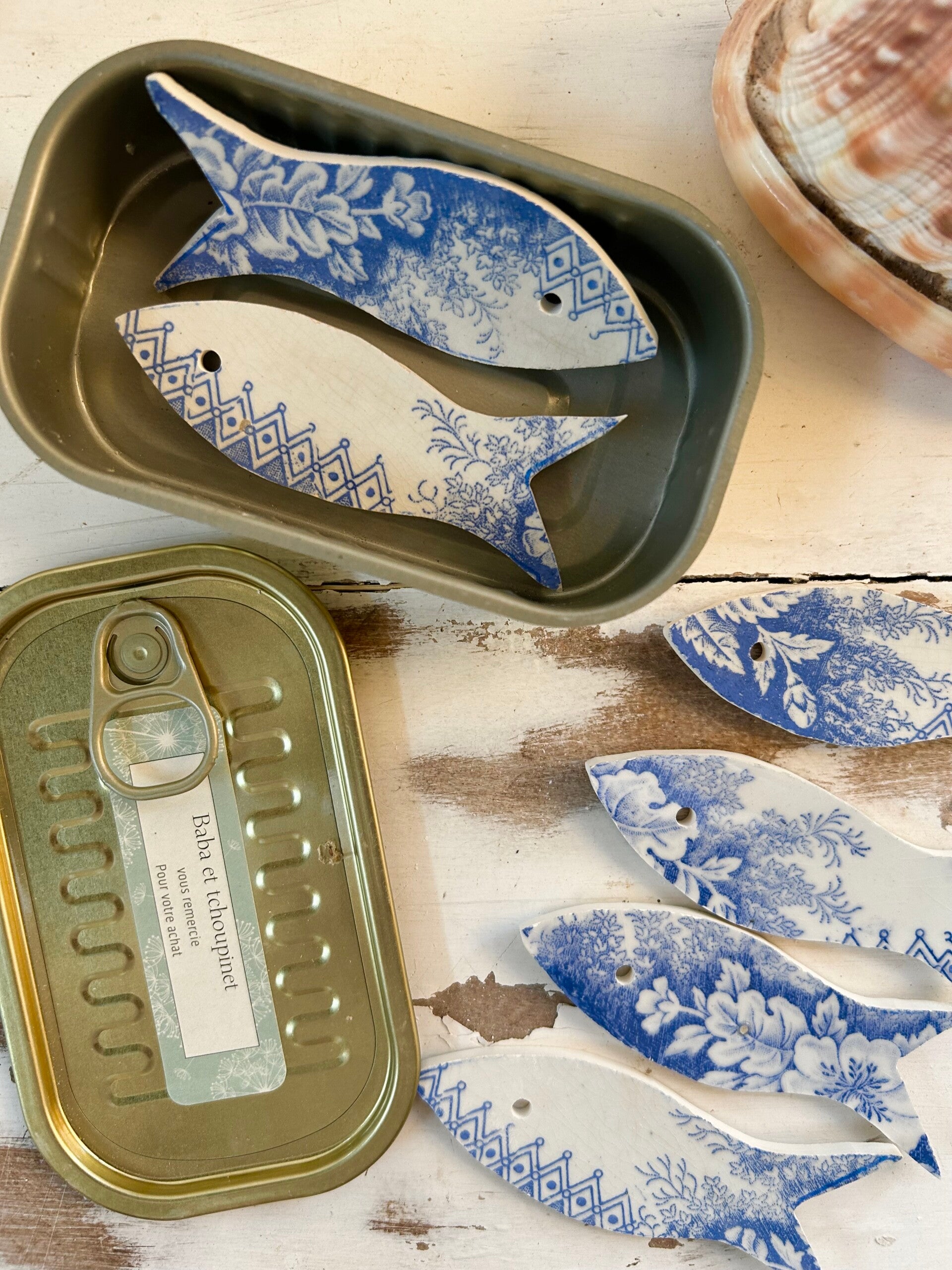 À l’intérieur, six sardines ont été taillées à la main dans une assiette ancienne en faïence Terre de Fer, signée Sarreguemines – modèle jardiniere
