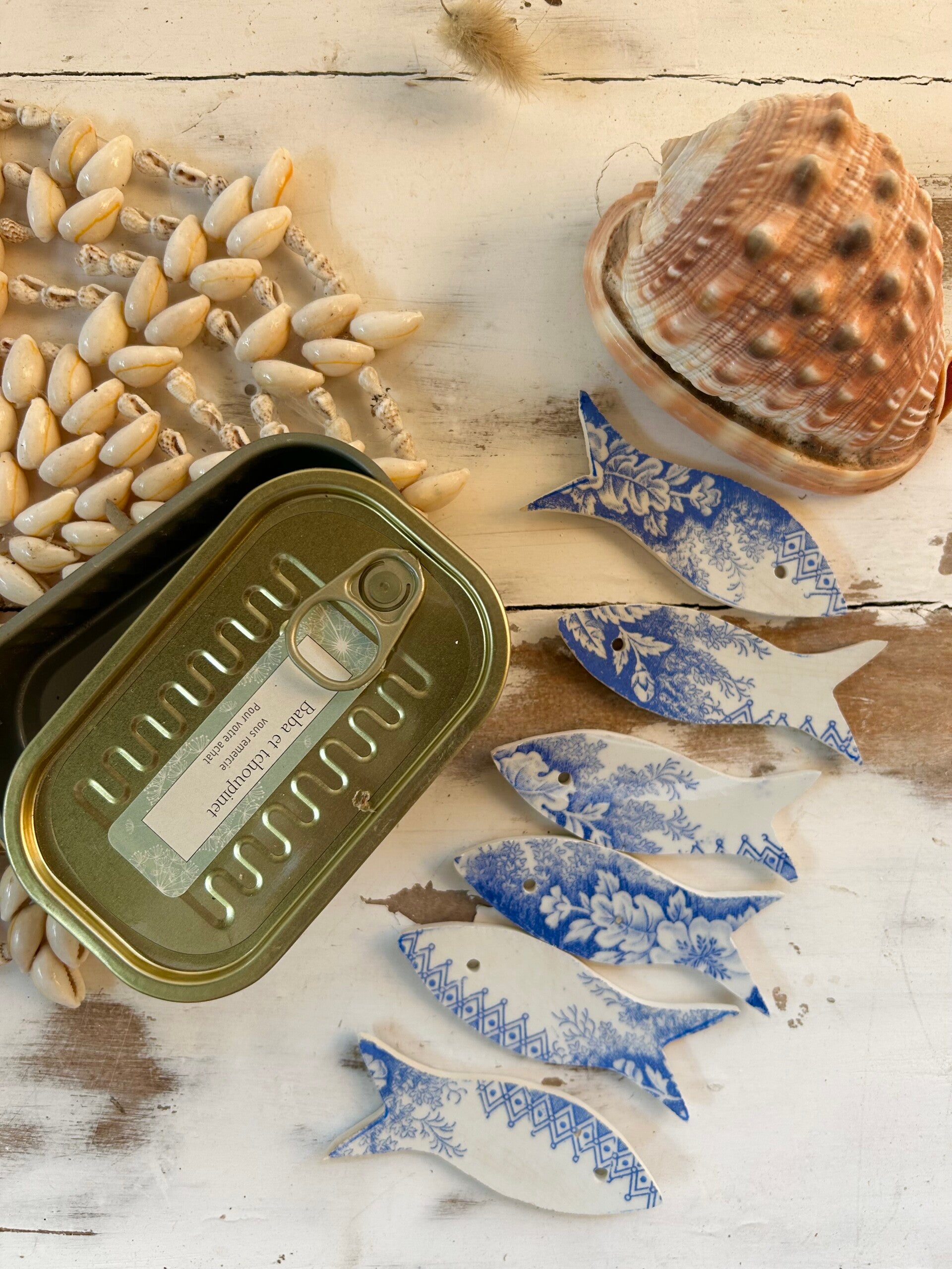 Chaque poisson conserve les traces délicates du décor d’origine, offrant un jeu de motifs et de teintes qui rendent chaque pièce singulière.