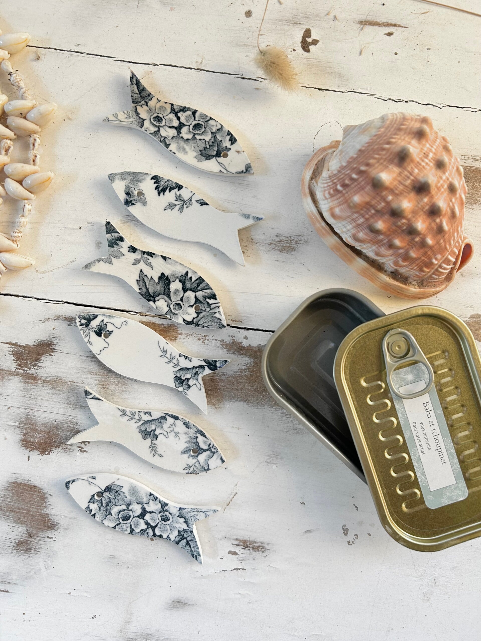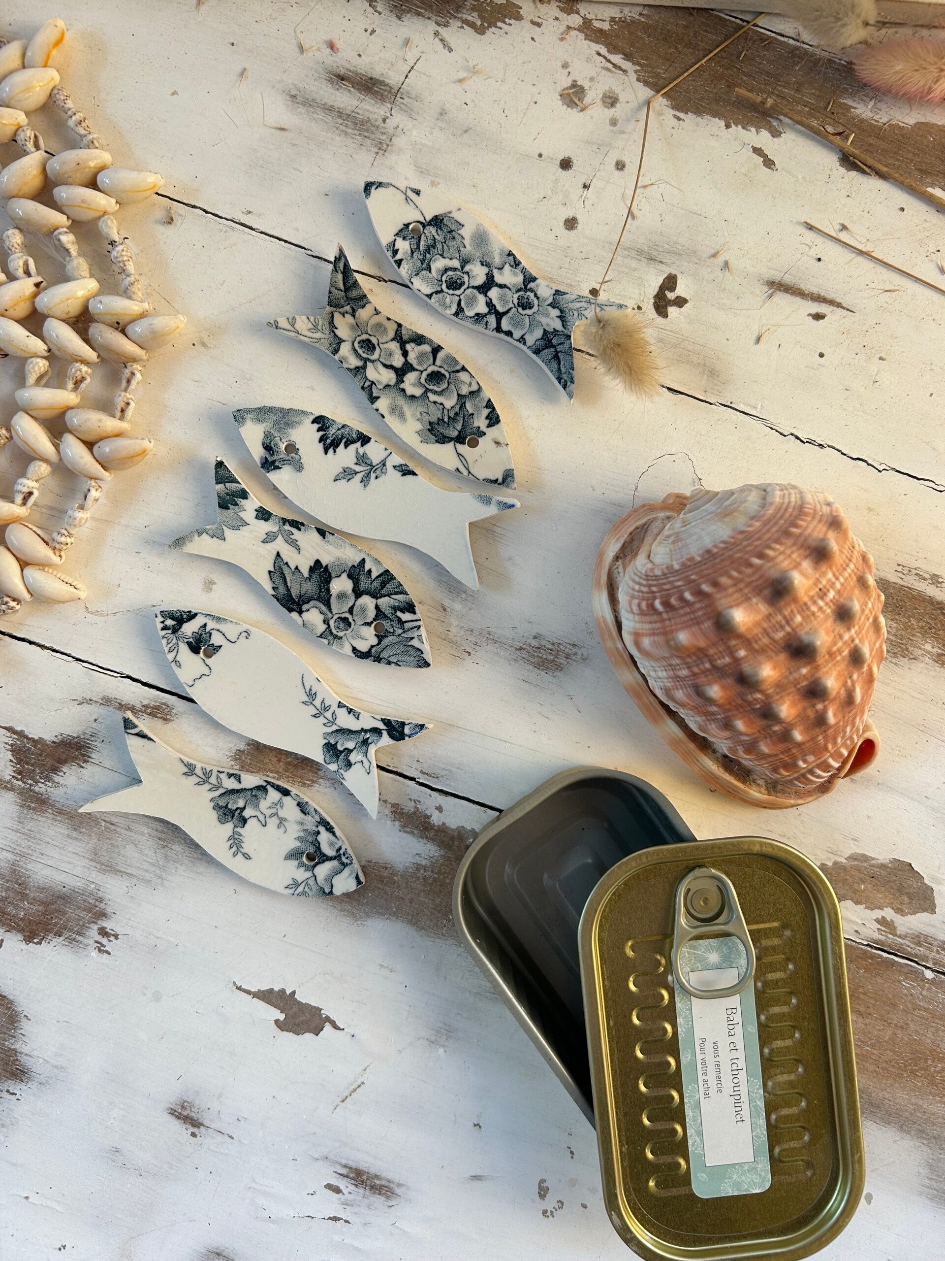 Chaque poisson conserve les traces délicates du décor d’origine, offrant un jeu de motifs et de teintes qui rendent chaque pièce singulière.