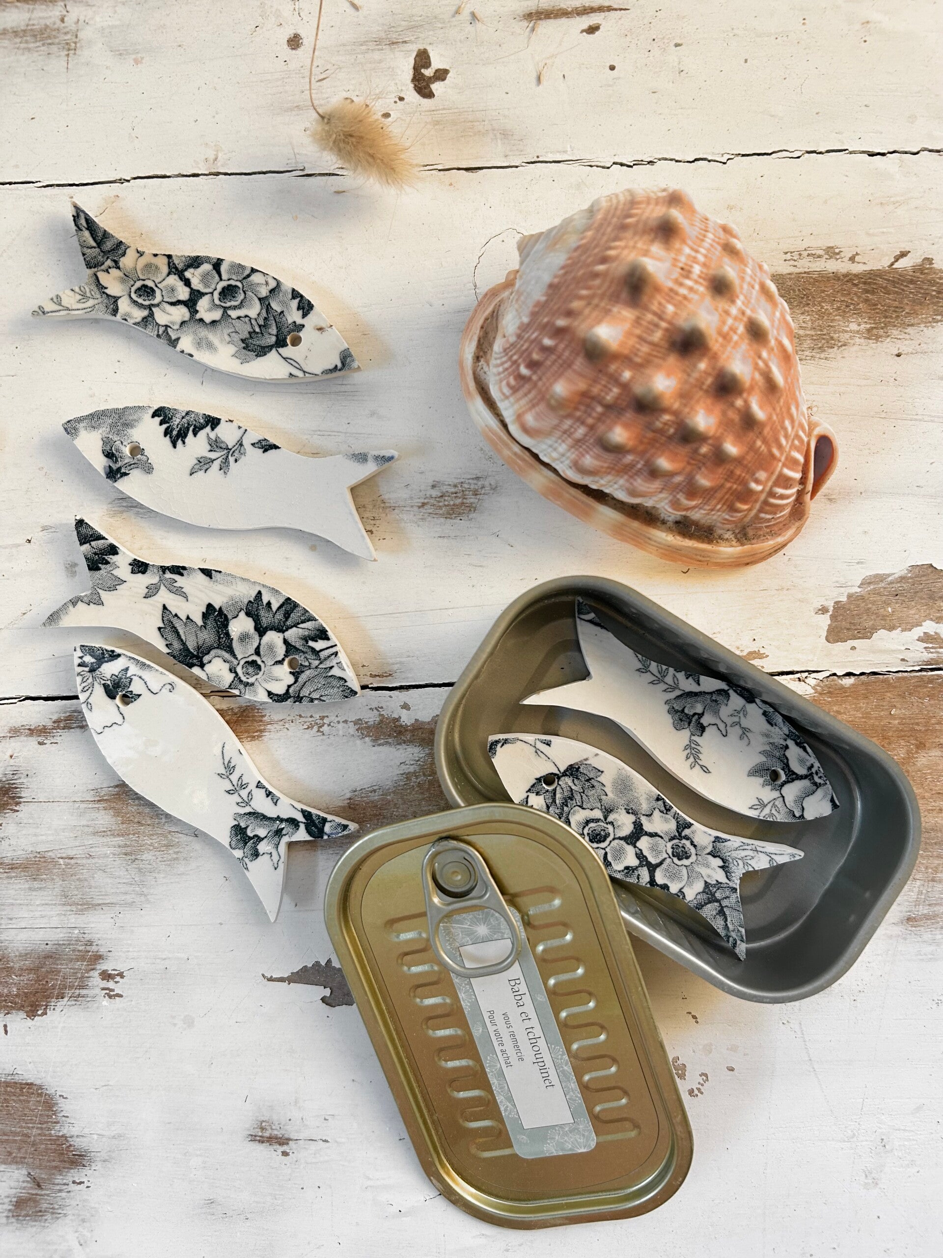 À l’intérieur, six sardines ont été taillées à la main dans une assiette ancienne en faïence Terre de Fer, signée Saint Amand- Marie Louise