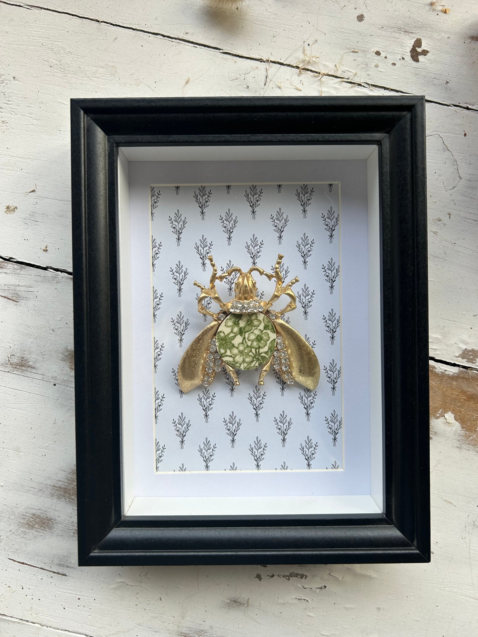 Cadre Cabinet de Curiosité – Insecte doré & faïence ancienne