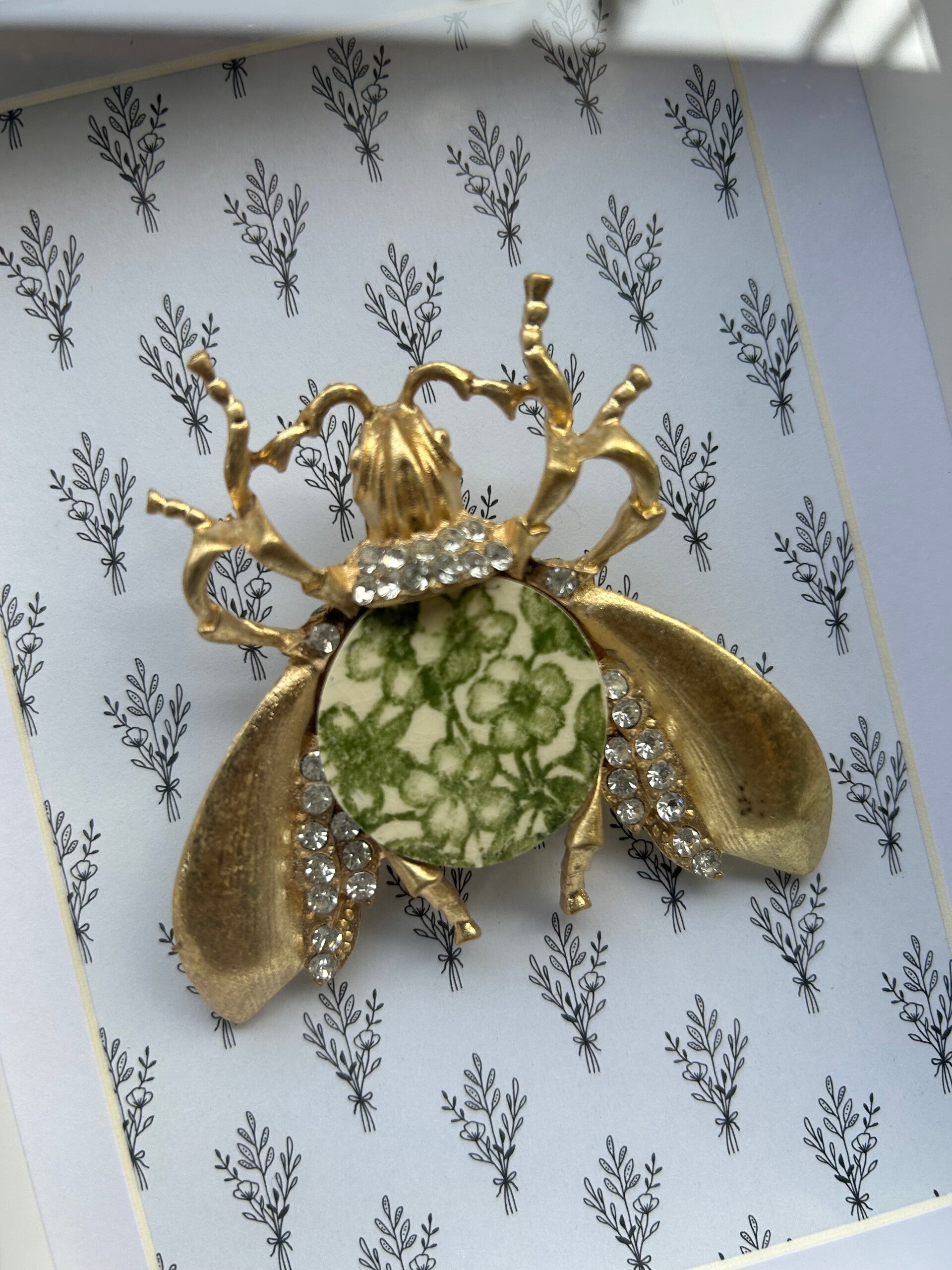 Chaque élément est choisi et assemblé avec soin, créant une pièce unique où la délicatesse de la faïence rencontre la symbolique de l’insecte.
