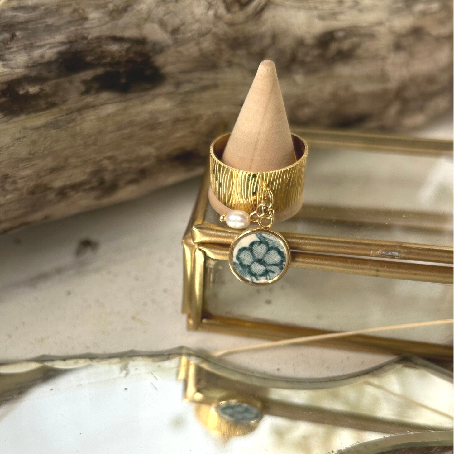 Bague dorée & faïence ancienne – Perle