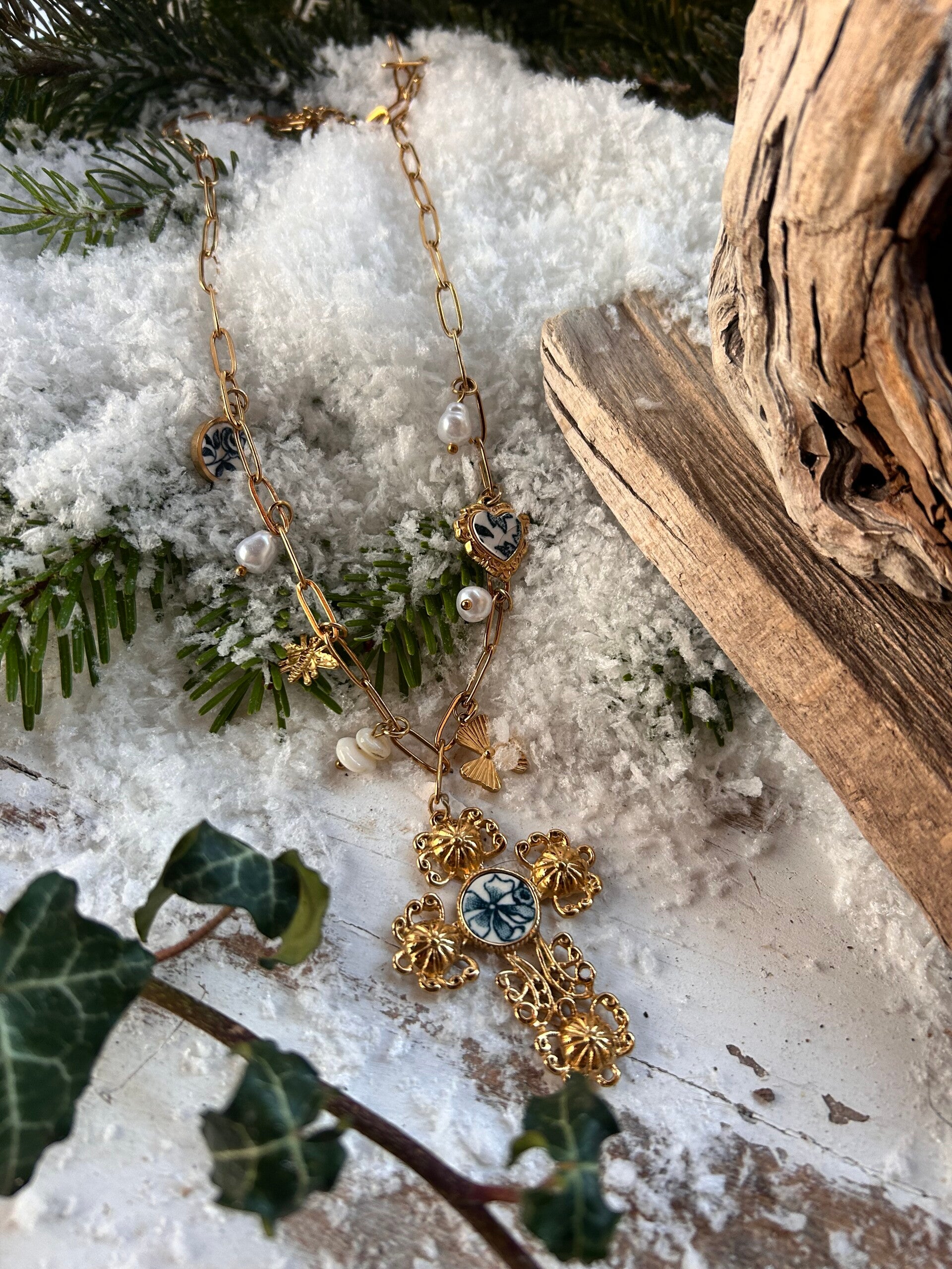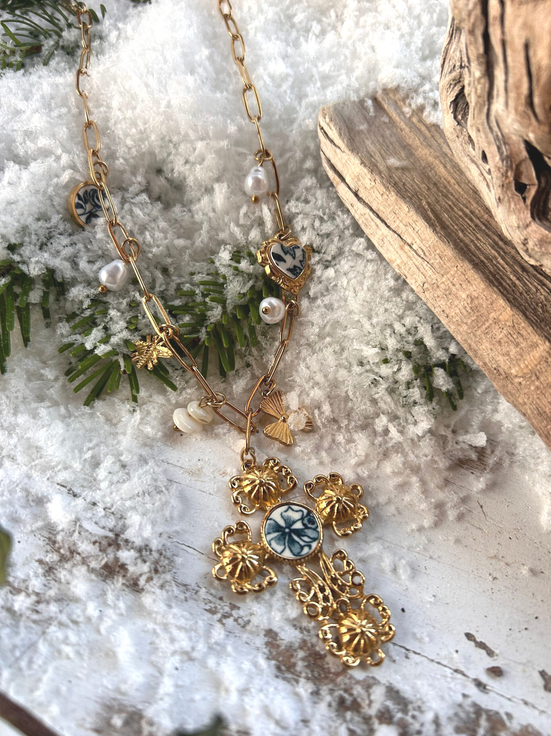 On y retrouve une croix et un ex-voto mais aussi un petit médaillon , façonnés à la main dans des assiettes anciennes en faïence Terre de Fer. Chaque fragment raconte une histoire et devient un bijou poétique.