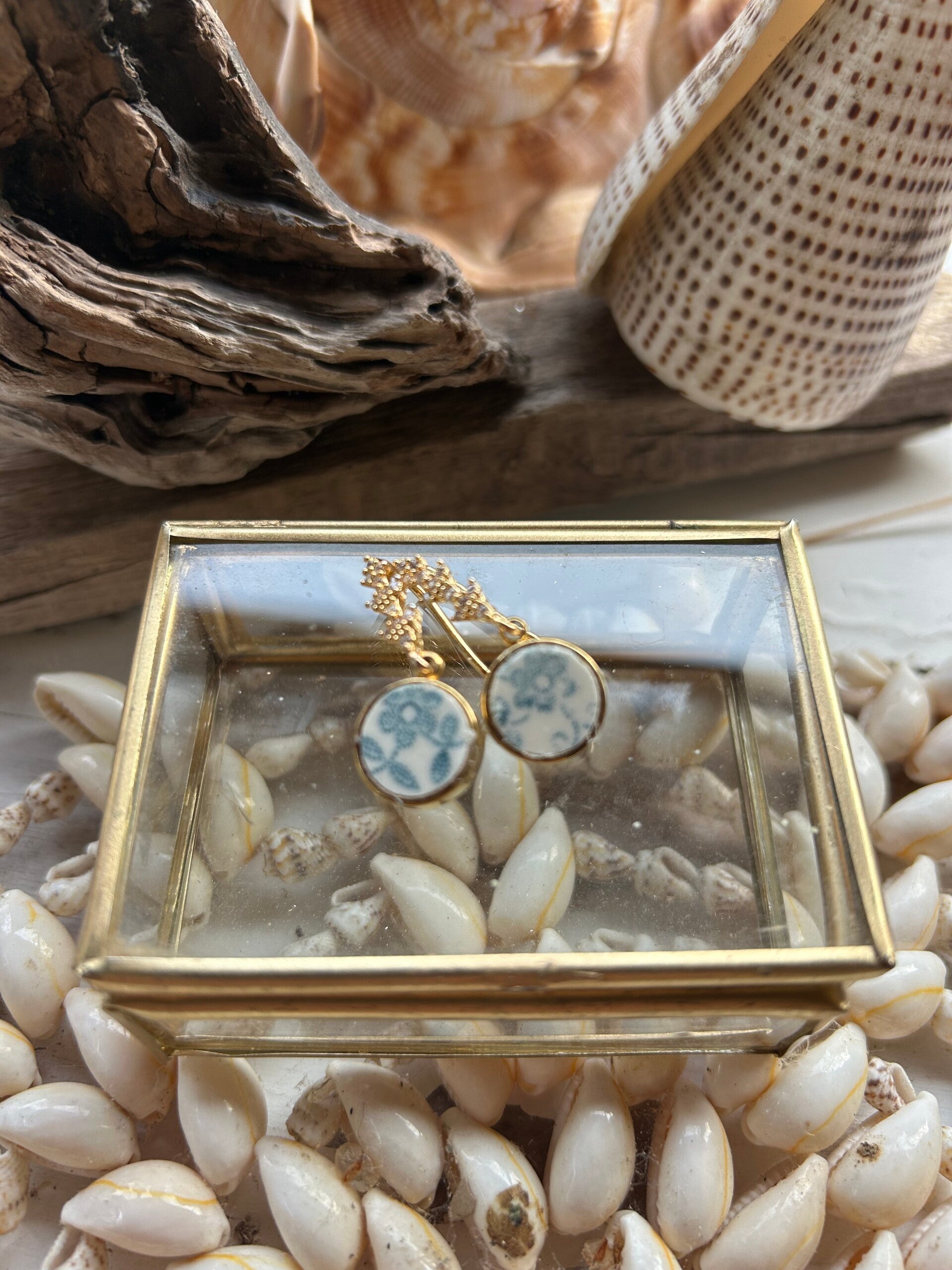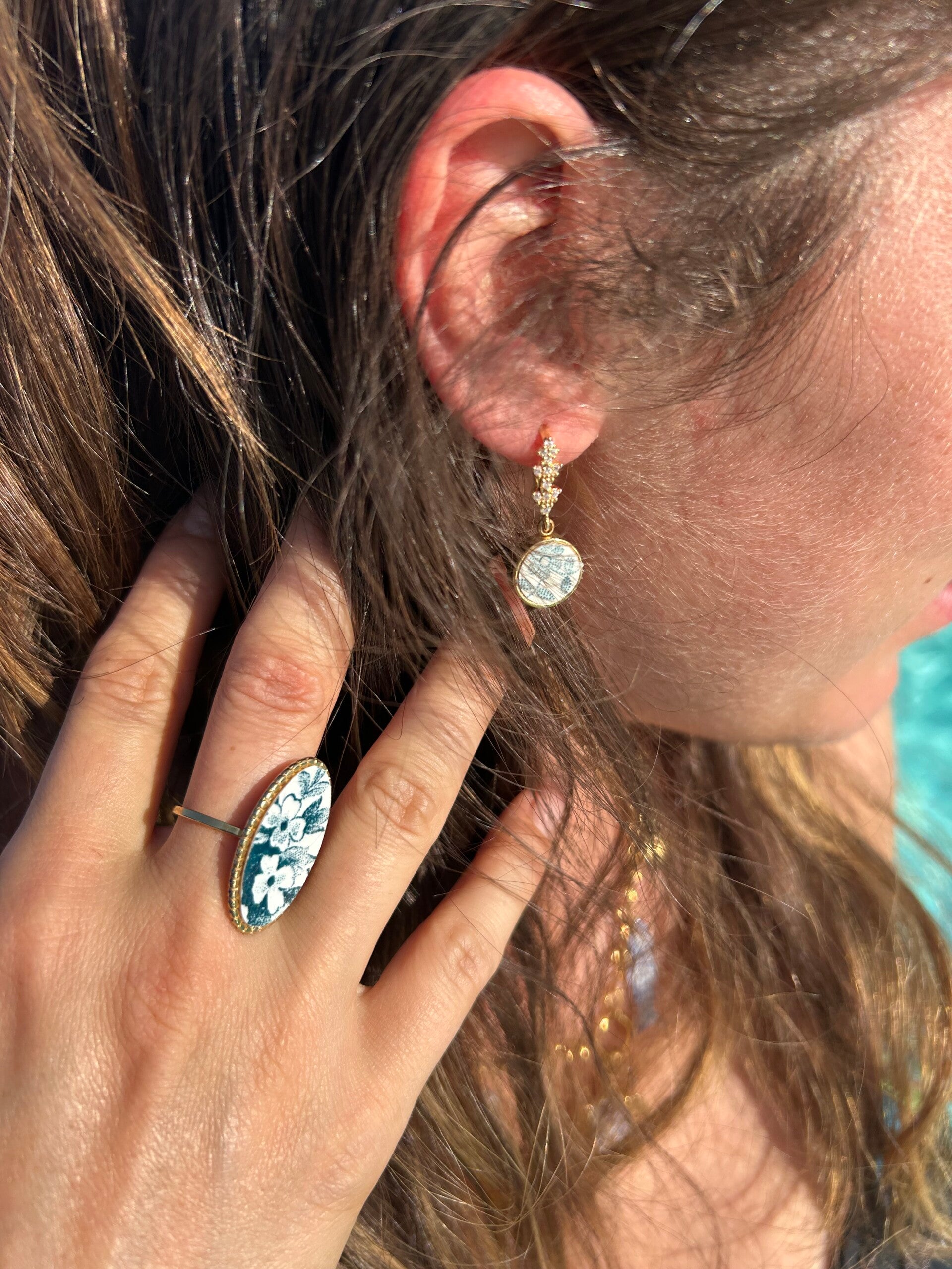 Ces boucles d’oreilles uniques allient l’élégance des strass scintillants à l’authenticité de la faïence taillée dans des assiettes anciennes. Chaque morceau de céramique raconte une histoire et retrouve une nouvelle vie dans un bijou délicat et raffiné.